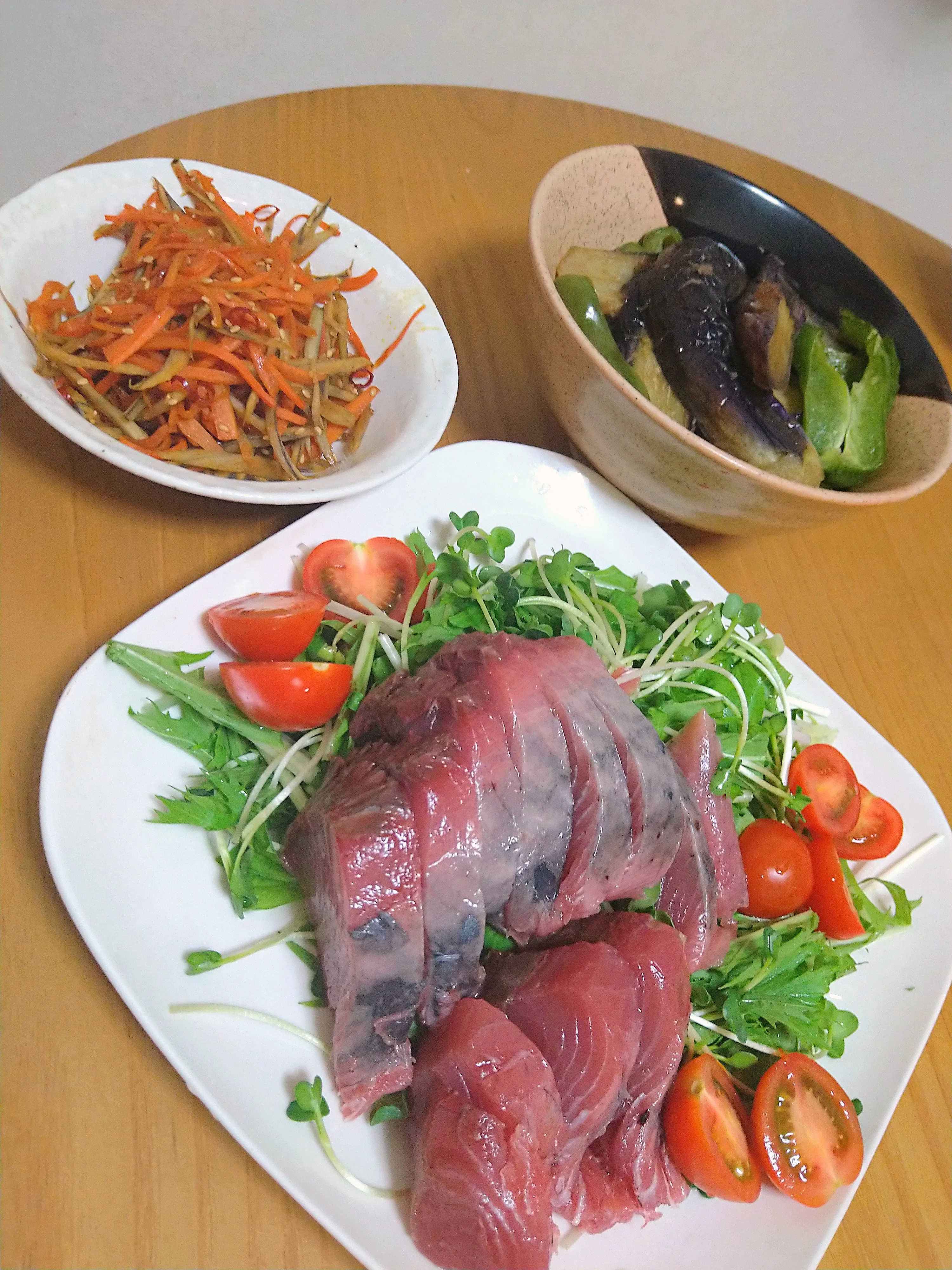 カツオはにんにくマヨ醤油で食べるのが好きです