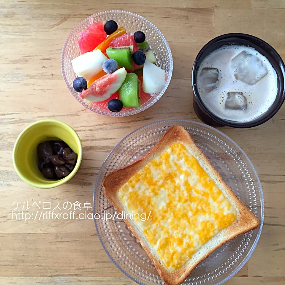 (朝食20150903)チーズトースト、フルーツ、アイスラテ、チョコ