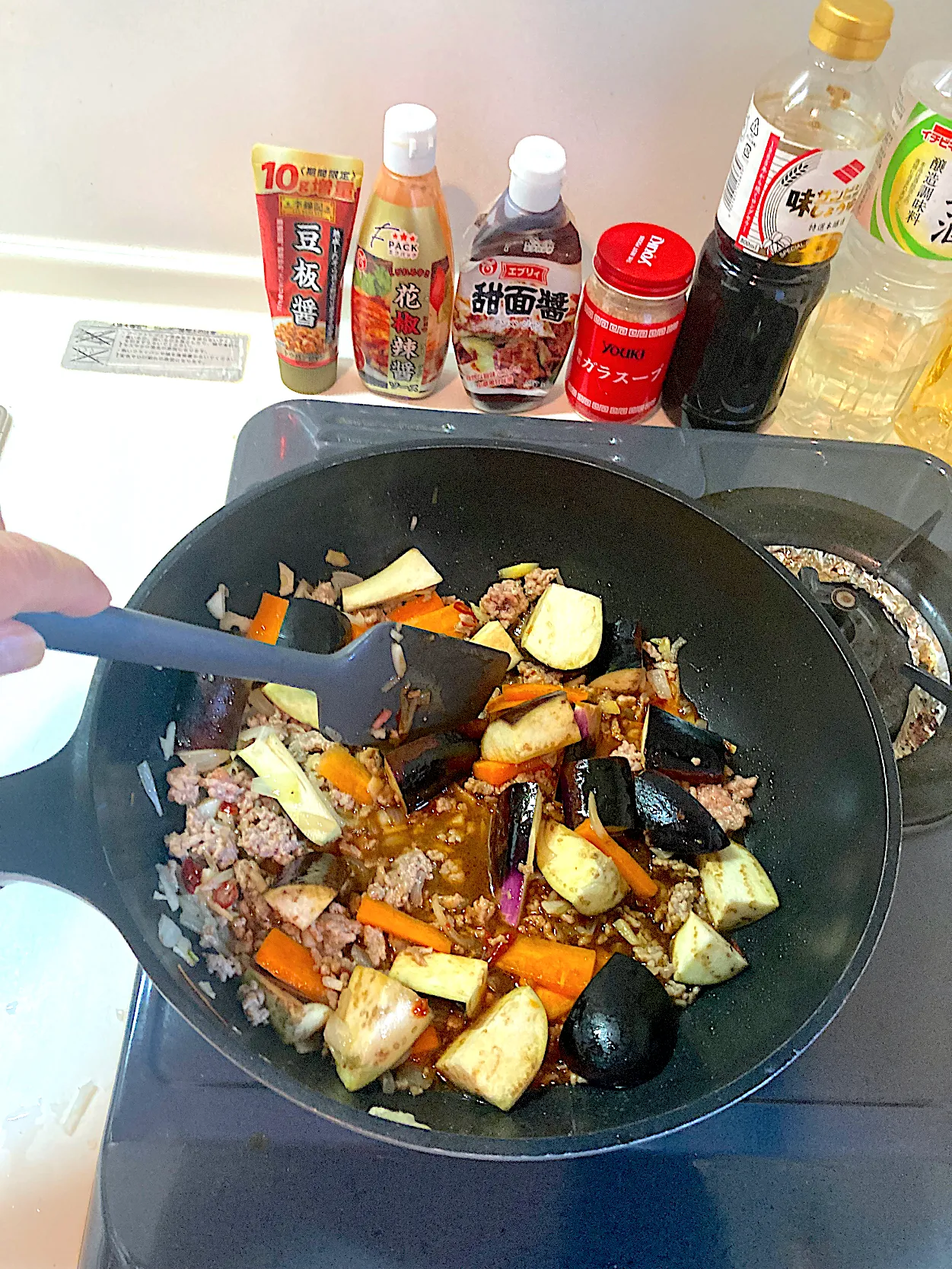 今日の晩ご飯④ 豆板醤、甜麺醤、花椒辣醬、醤油、酒、みりん、ガラスープを入れ、さらに炒めます