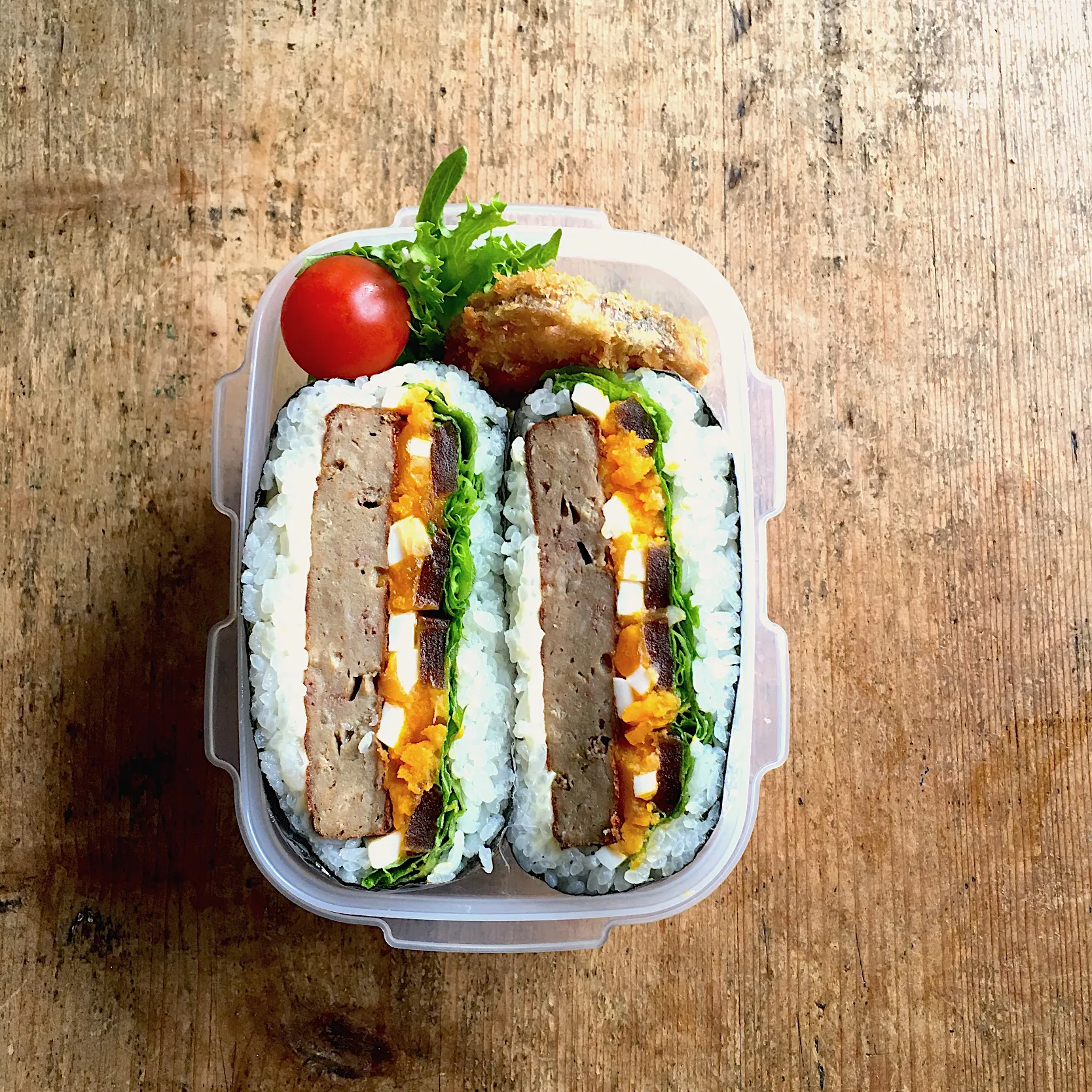 マルシンハンバーグとチーズ、ゆで玉子、奈良漬のライスバーガー弁当‼︎(笑)