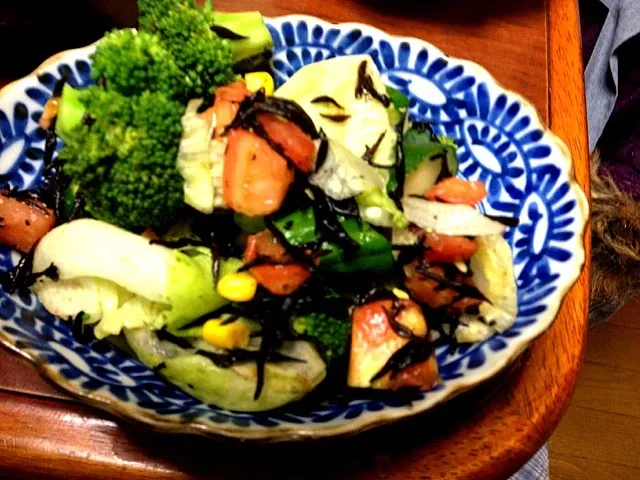 サラダの中身☆ブロッコリー、きゅうり、トマト、コーン、レタス、ひじき。味付けは塩コショウのみです。