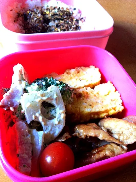 6月27日、週の真ん中水曜日のお弁当。結局こういうのが一番喜ぶ肉焼いて焼肉のタレたらめただけ・ブロッコリーレンコンベーコンのゴママヨサラダ・卵焼き・小さな小さなミニトマト・ふりかけご飯。