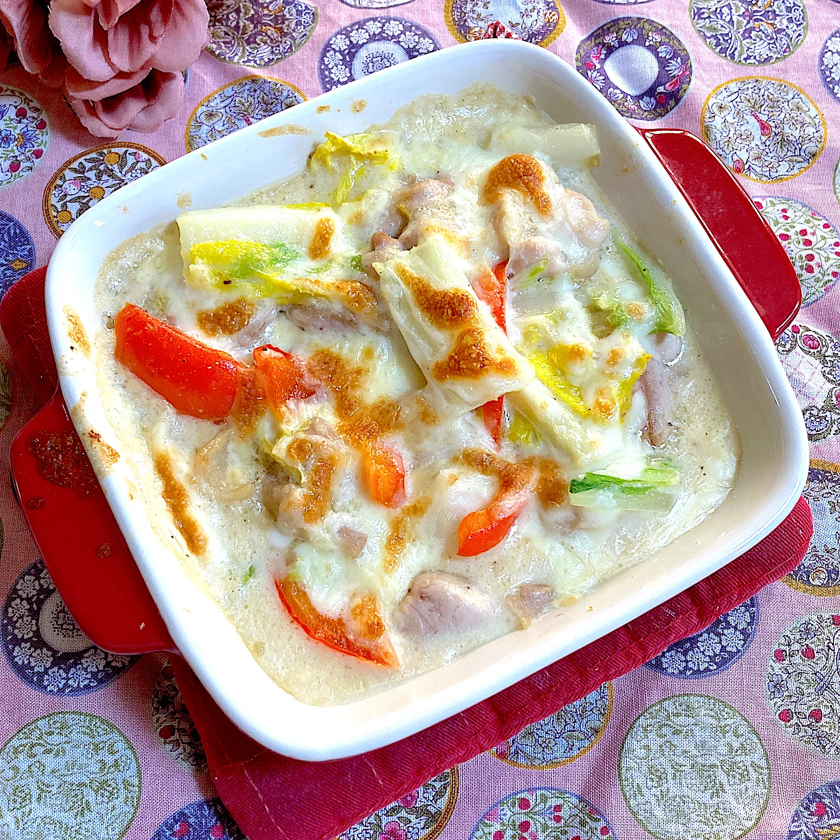 今が旬の白菜に鶏肉と牛乳使いでグラタン風にしました😄