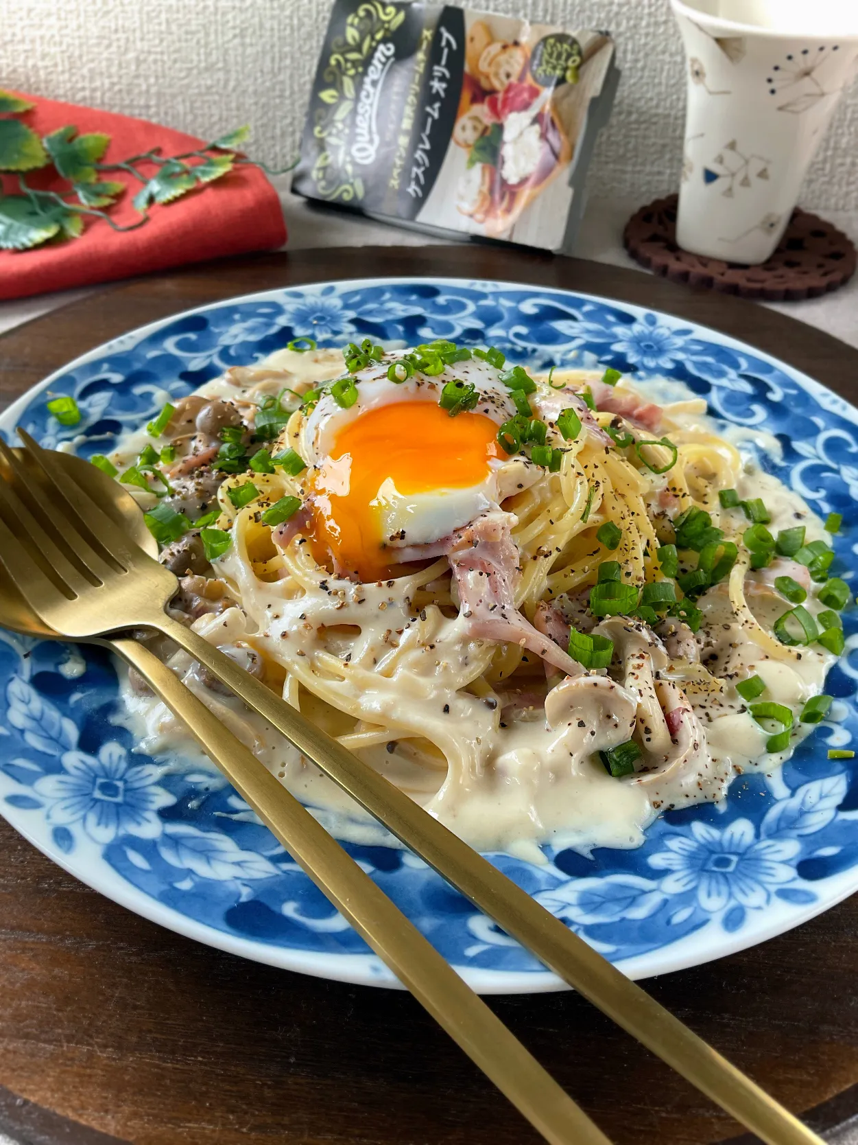 温玉を乗せたら、カルボナーラみたいになりますね!