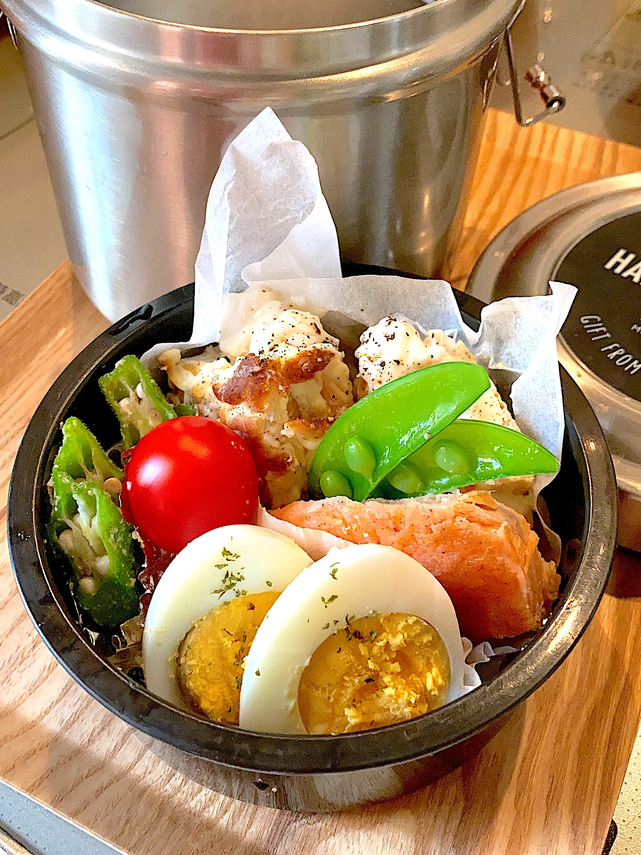 塩茹でスナップエンドウ/ゆで卵/オクラごま和え/ミニトマト