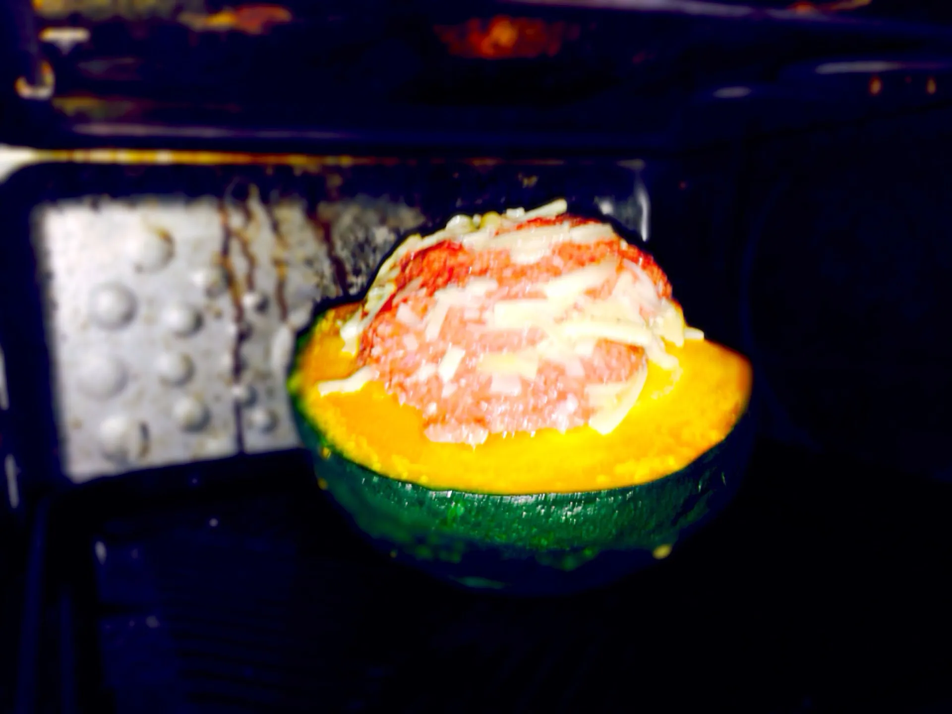 風ちゃんがカボチャの肉詰めを食べた〜い💕というのでカボチャのチーズハンバーグ詰め🌺