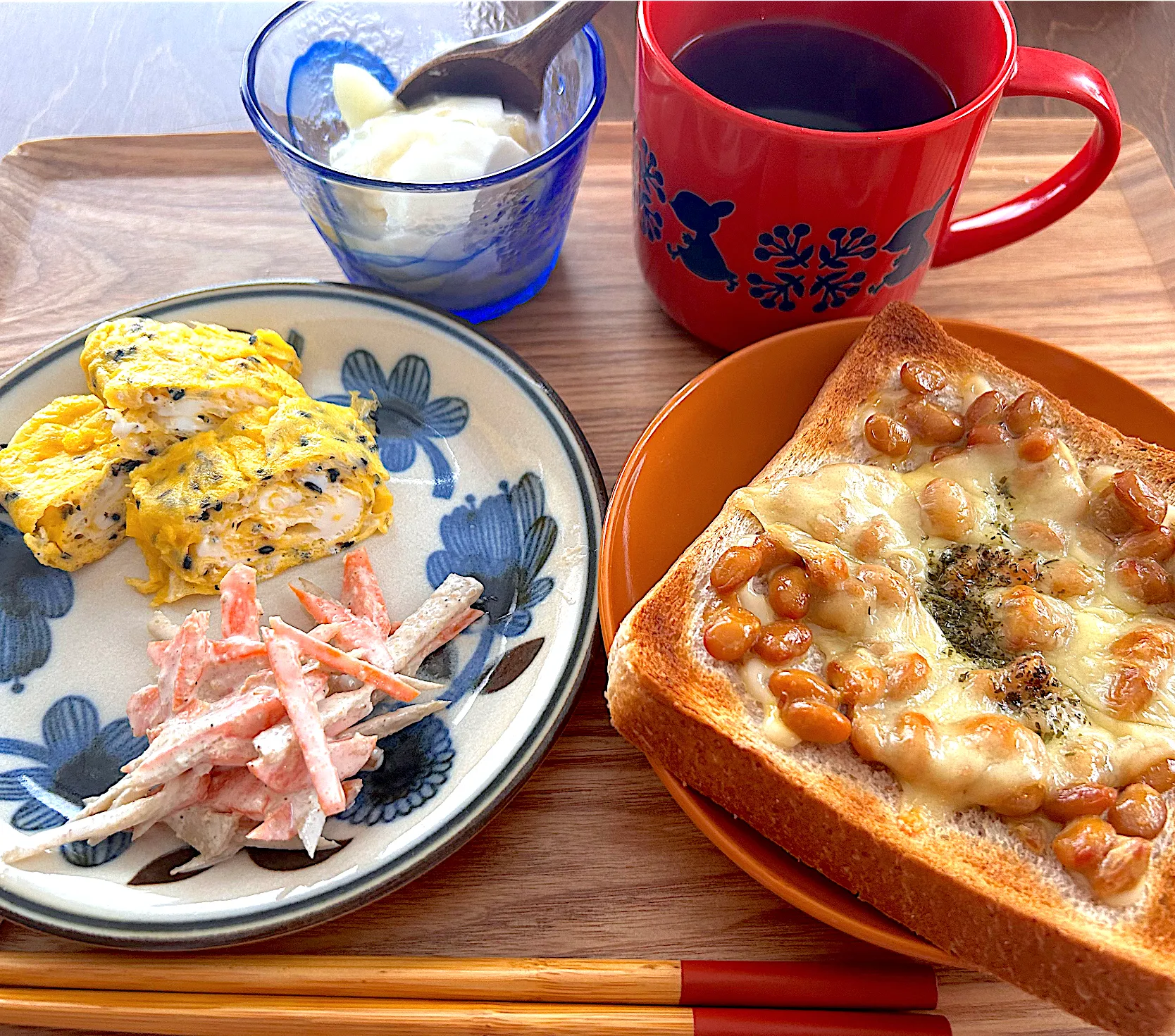 定番の納豆トーストは、少しマヨネーズをしいてコクが出たかなと、、!