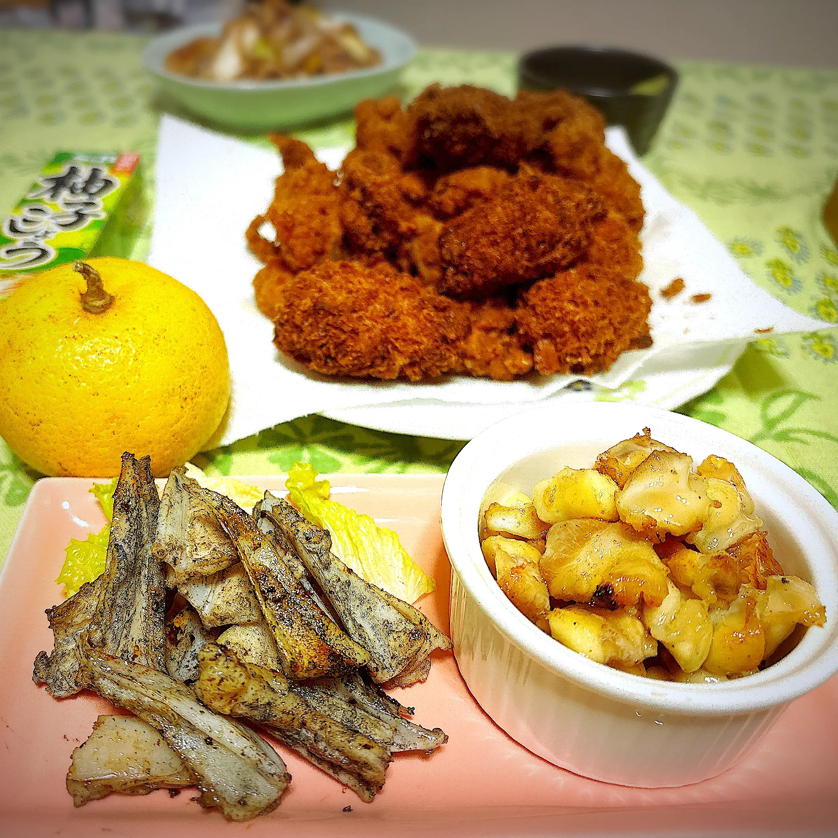 私 揚げ物無理なので娘が牡蠣フライとイカゲソ唐揚げを。