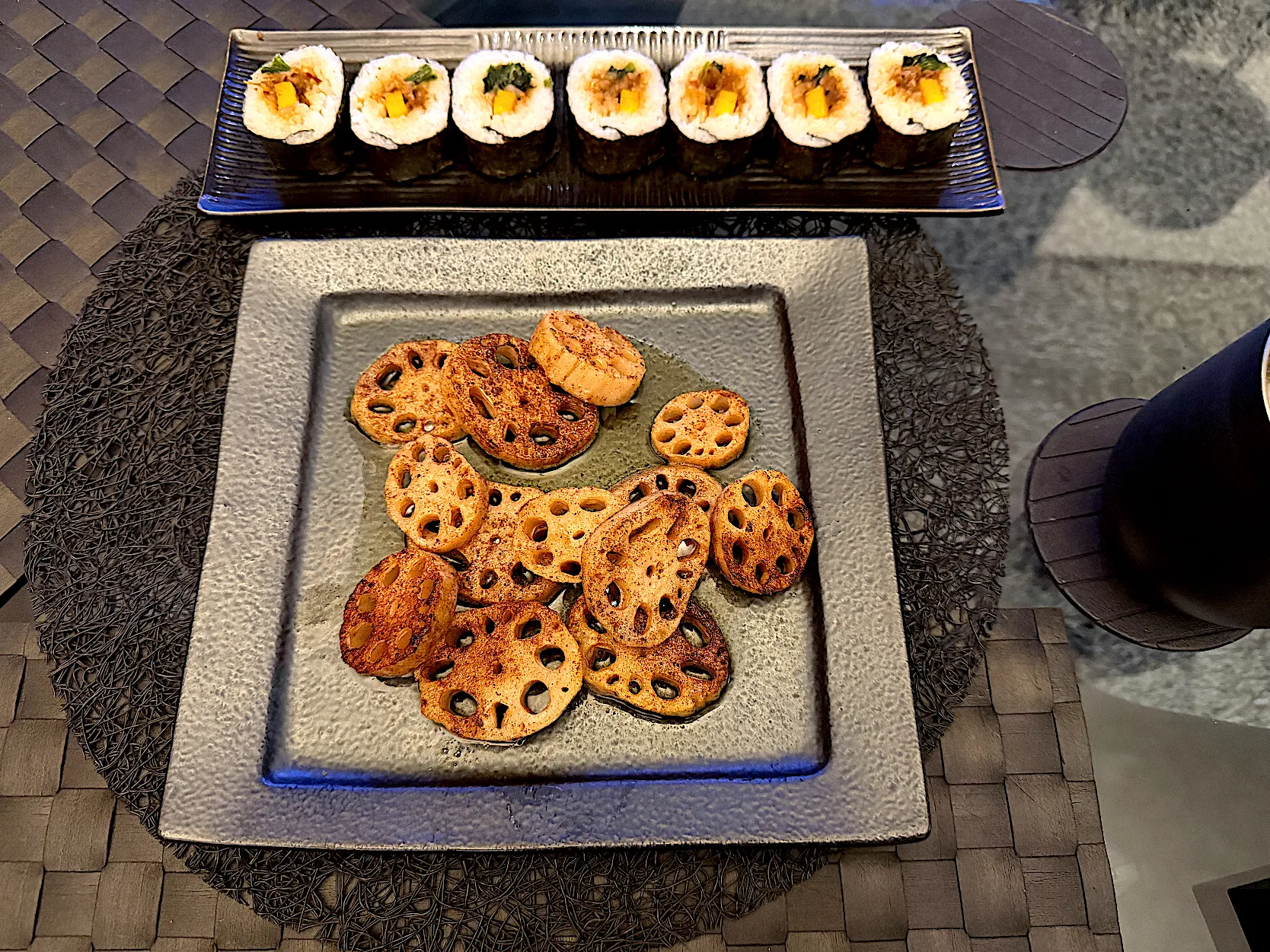 今夜の娘の晩酌おつまみは、キンパ(冷凍)と蓮根バター醤油焼き✨