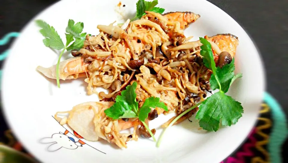 夫の手料理:シャケのムニエル、きのこの味噌バターソテーがけ