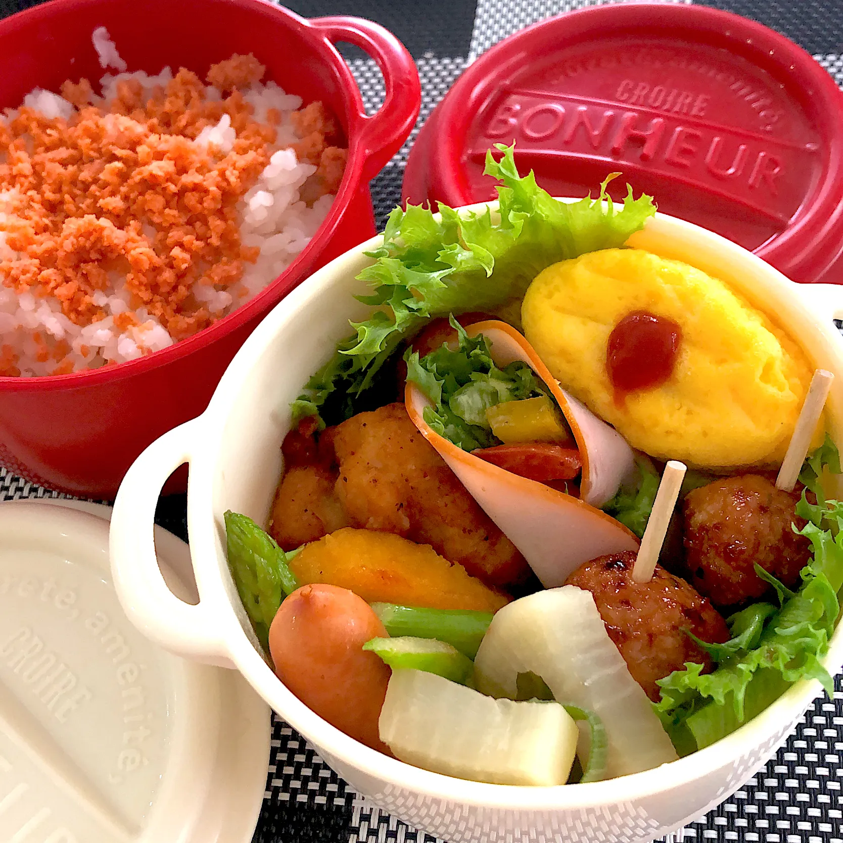 #お弁当 #お昼ご飯 #ハム/ソーセージ/ベーコン #揚げ物 #保存食/常備菜 #オムレツ #煮物