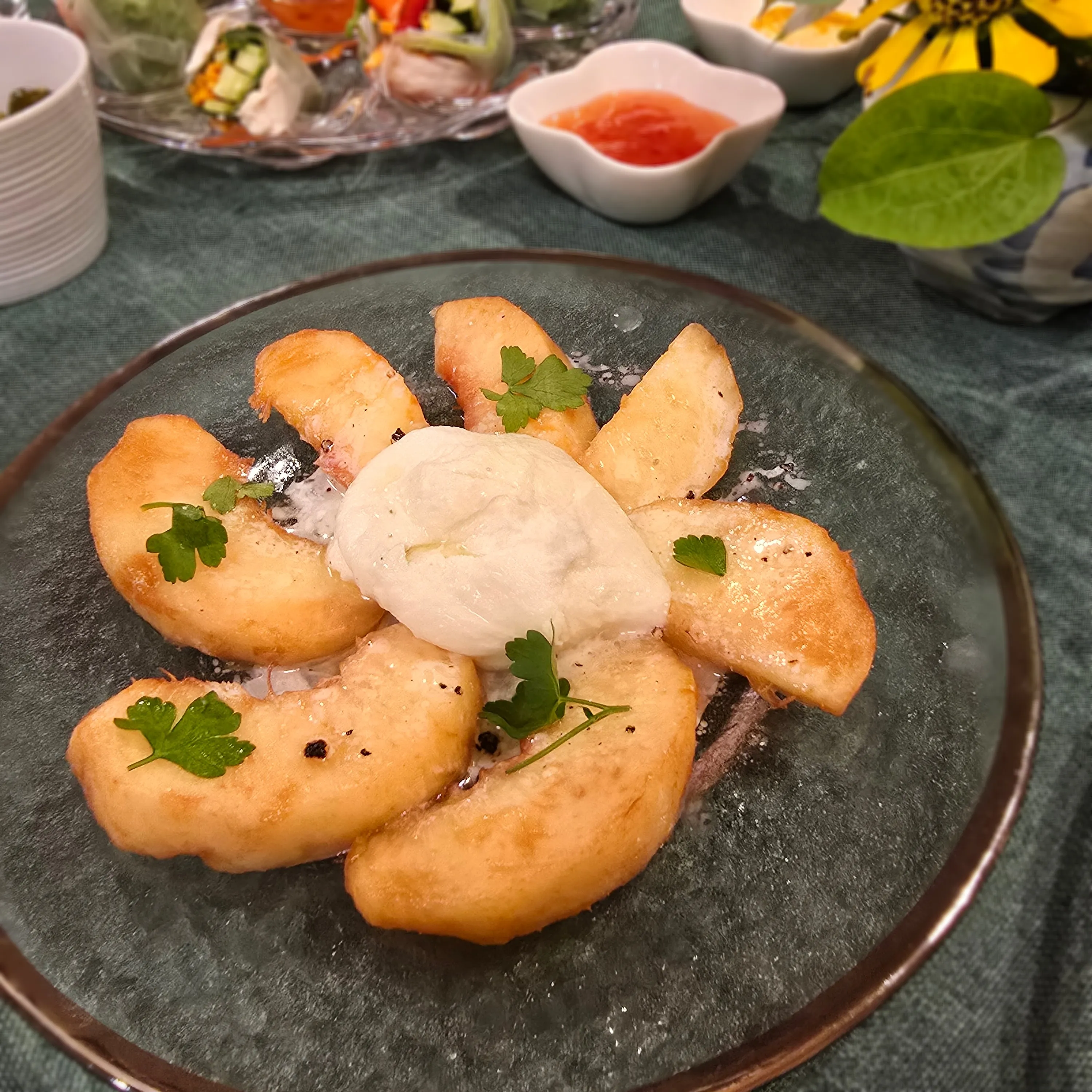 ワインに合うおつまみをリクエストされたので桃とブッラータチーズでカプレーゼを作りました~