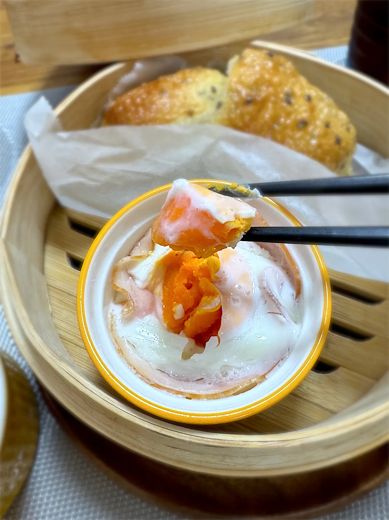 ココットにハムを引いてその上に卵を割ほぐして約5分蒸して完成。前回より好みの日の通り具合になりました〜