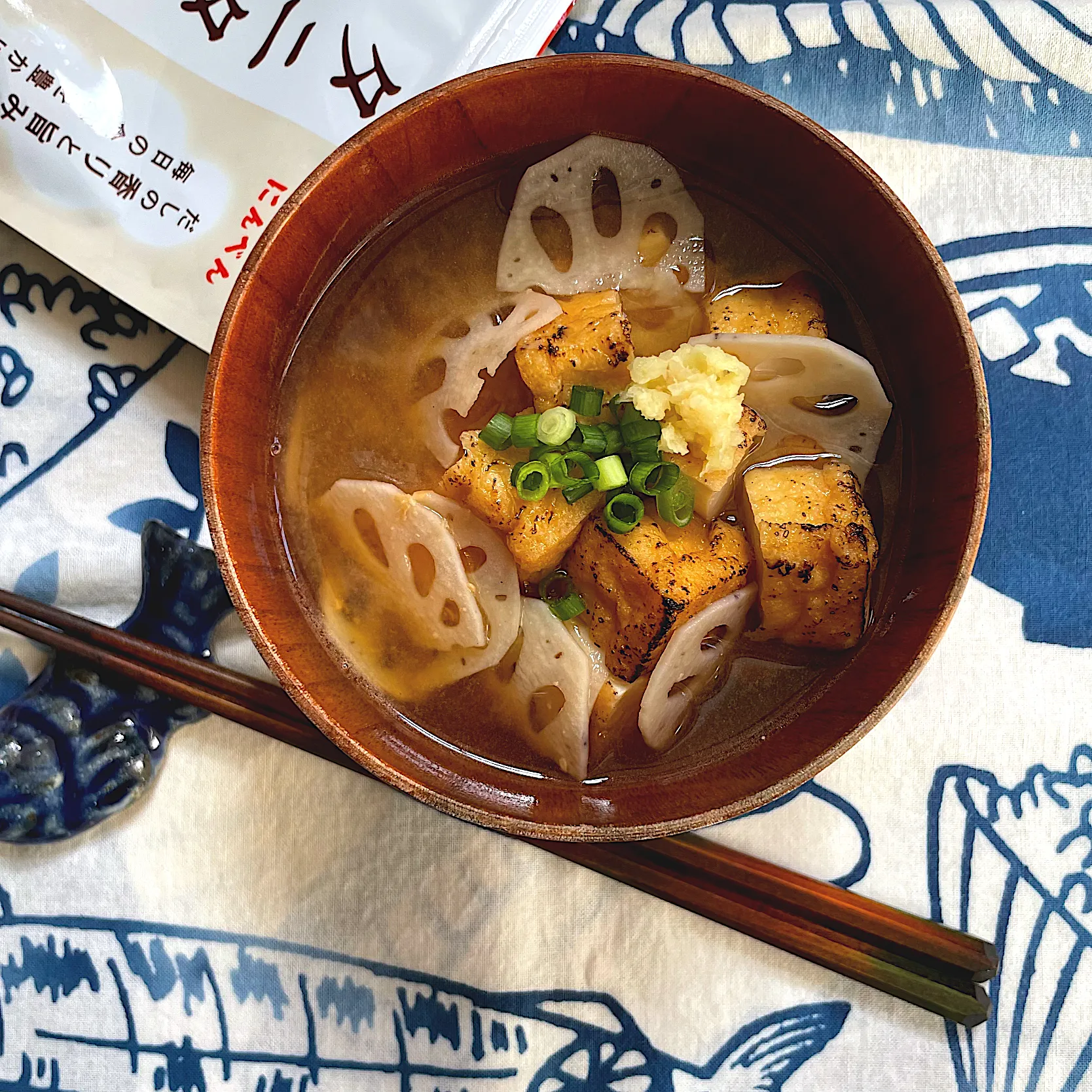 #味噌汁 #家庭料理 #麦味噌 #にんべん #タニタ #にんべんだしアンバサダー #だしのある生活 #にんべんタニタとだし味噌汁 #PR #蓮根 #和食 #蓮根の日(11月17日) #絹揚げ #厚揚げ