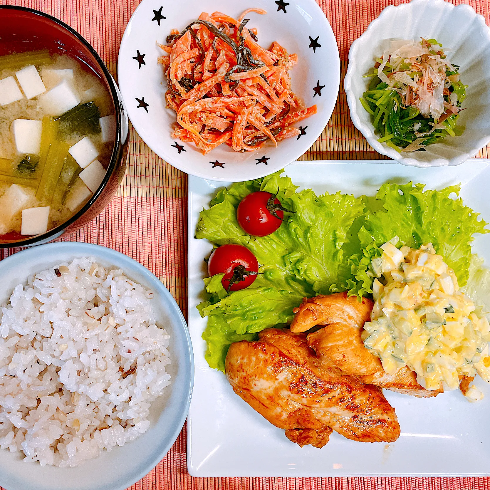 ささみのチキン南蛮♡三葉のお浸し♡にんじんと塩昆布のサラダ♡お味噌汁♡