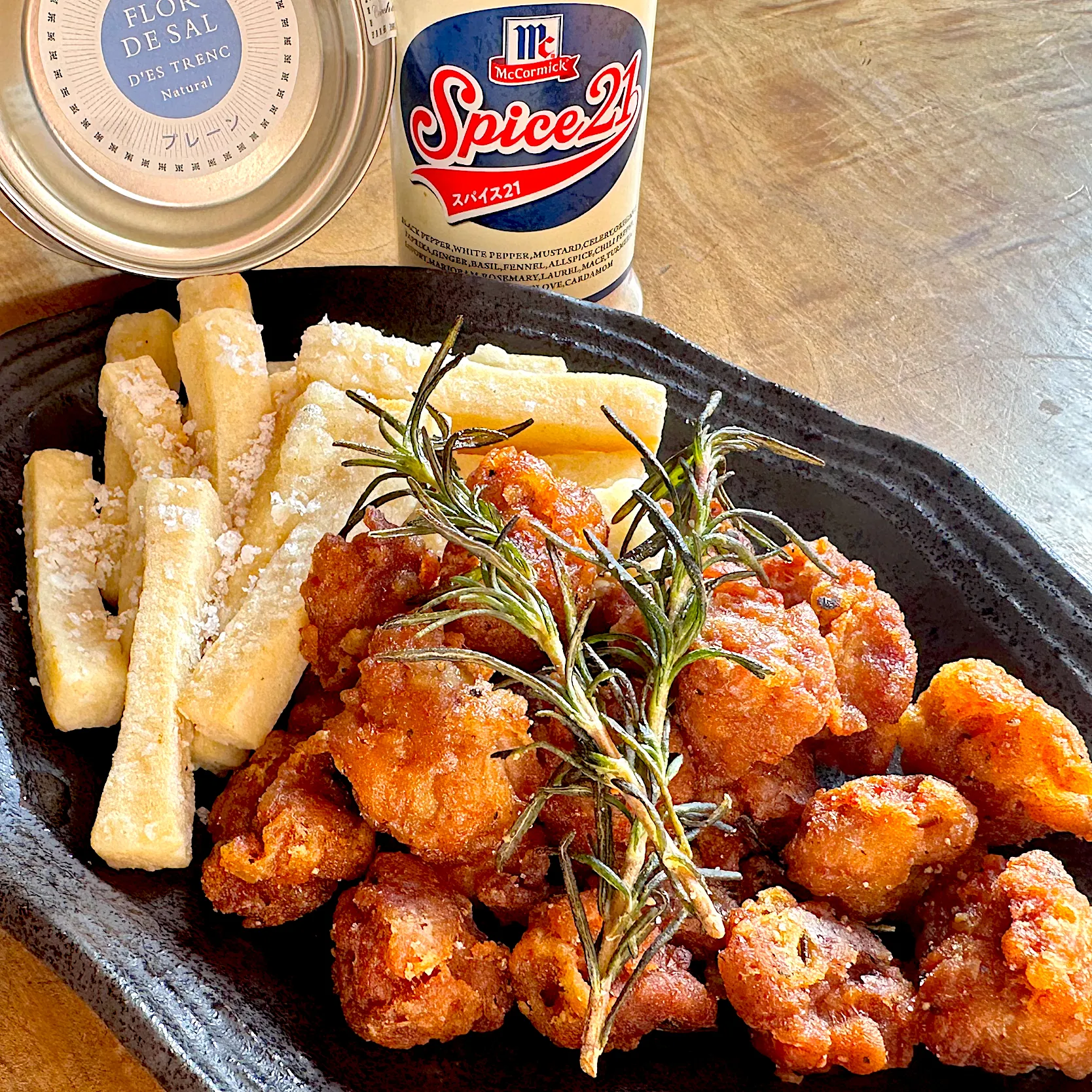 スペインと言えばイベリコ豚?生ハムのイメージも強い。本来なら塊肉を細かく切って、パプリカやガーリックなんかとマリネするらしいが、うちにあるのは豚こま。まあ、これで良しとしよう!って事でパプリカパウダーと片栗粉で豚こまを揉み揉みして焼いた。油が出る出る。ペーパー2枚分吸い取った。これでヘルシーになったはず!?焼き上がりにスパイス21。これをかけるために漬け込みはシンプルにしたのさ。結構かけても大丈夫だった。最初蓮根にかけた時にしょっぱかったから恐る恐るだったけど、肉にはちょうど良いみたい。スペインのバルではポテトと一緒に提供されることが多いみたいだから、ポテト添えたかったんだけど、ジャガイモなかったから、例のアレで。でも、ポテトにみえん?高野豆腐には見えんよな。な。な。これにはマヨルカ島のお塩を。おう!飲みたくなってきたぜ!