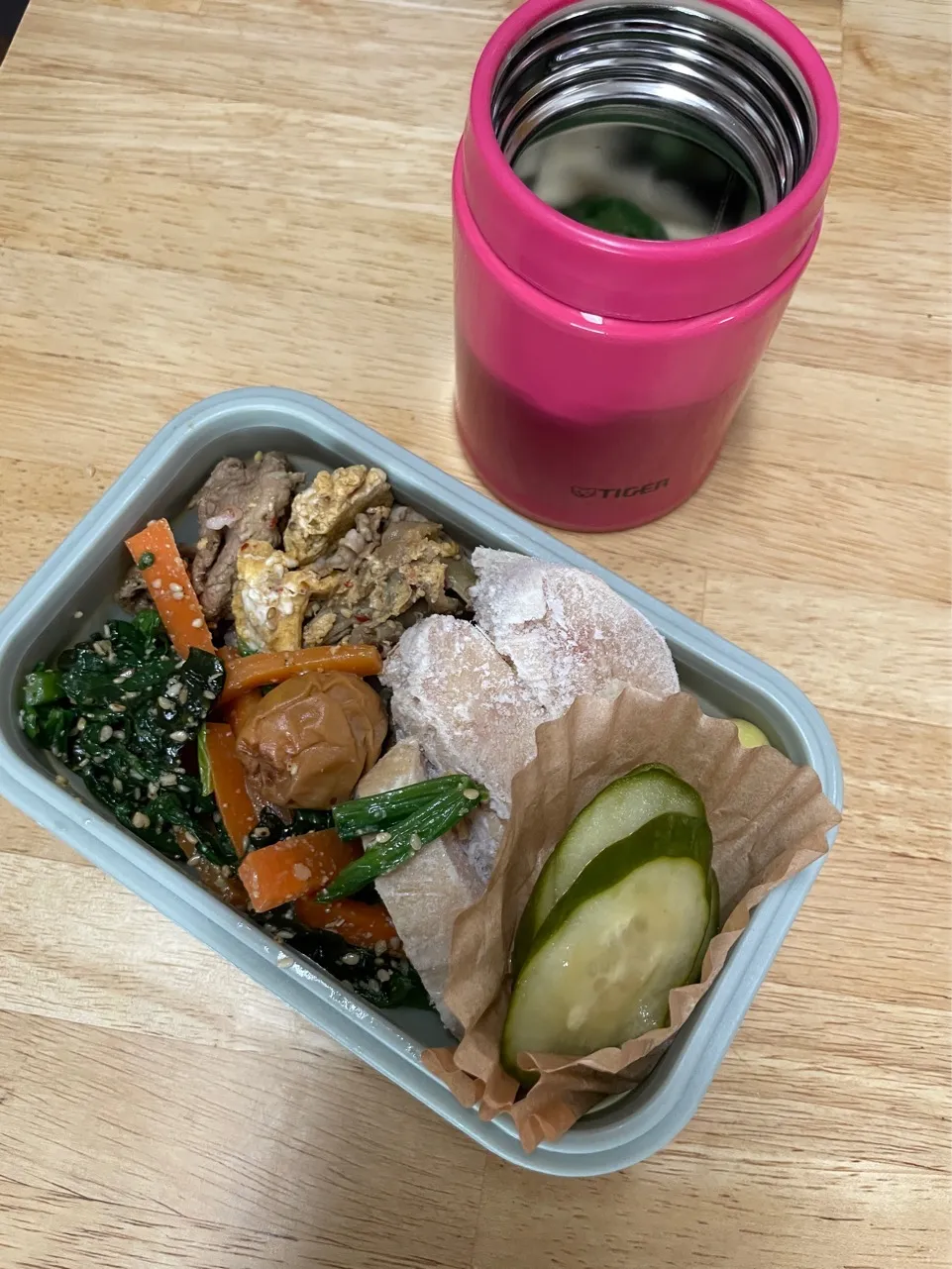 豚肉のゴーヤチャンプル、小松菜とにんじんナムル、鶏胸肉ソテー、梅干し、きゅうりの甘酢漬、ごはん、味噌汁