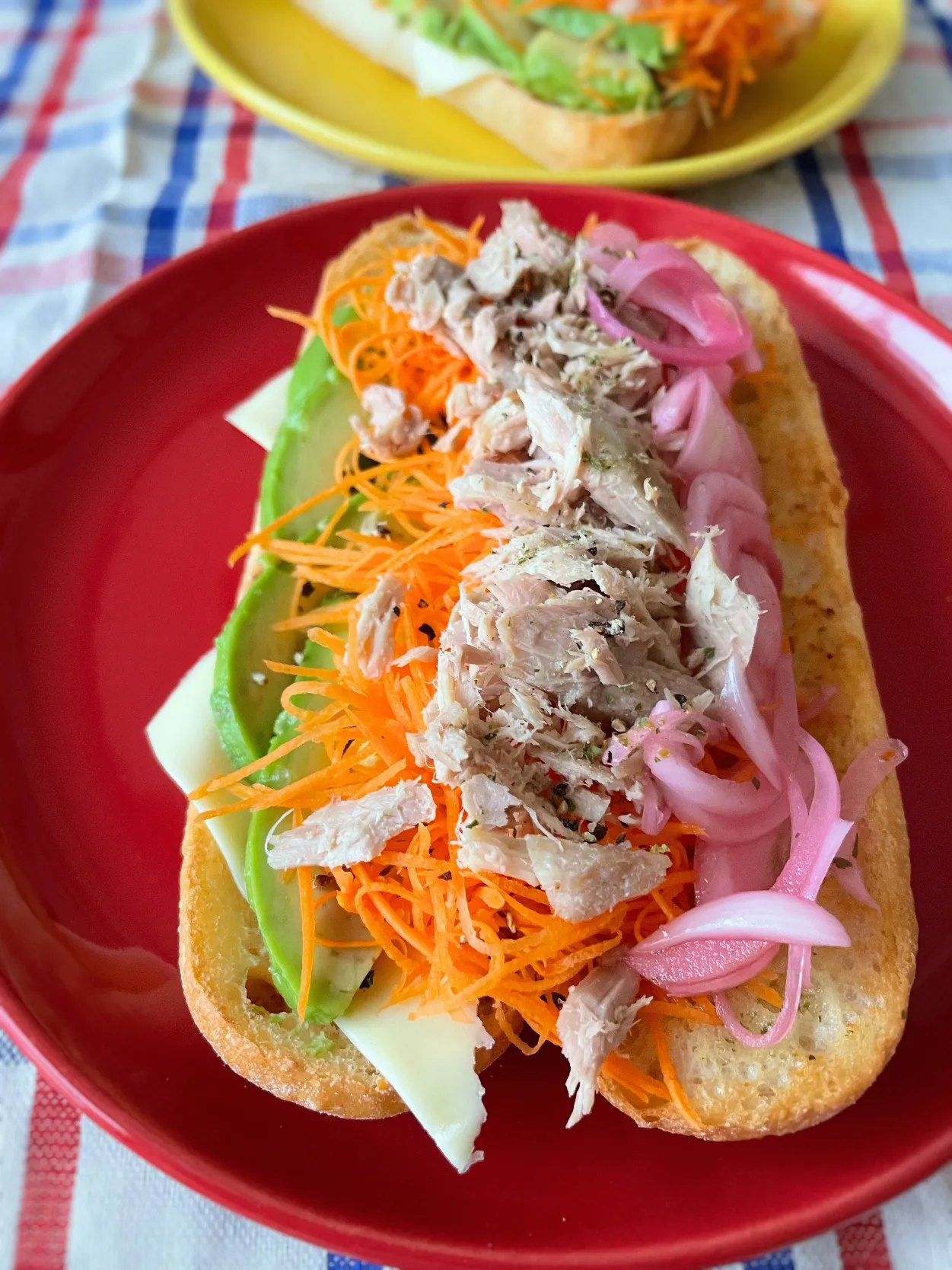カリッとトーストしたパンにツナ、生野菜、玉ねぎの酢漬け、チーズ、マヨネーズをニュッとしてパクーーー!