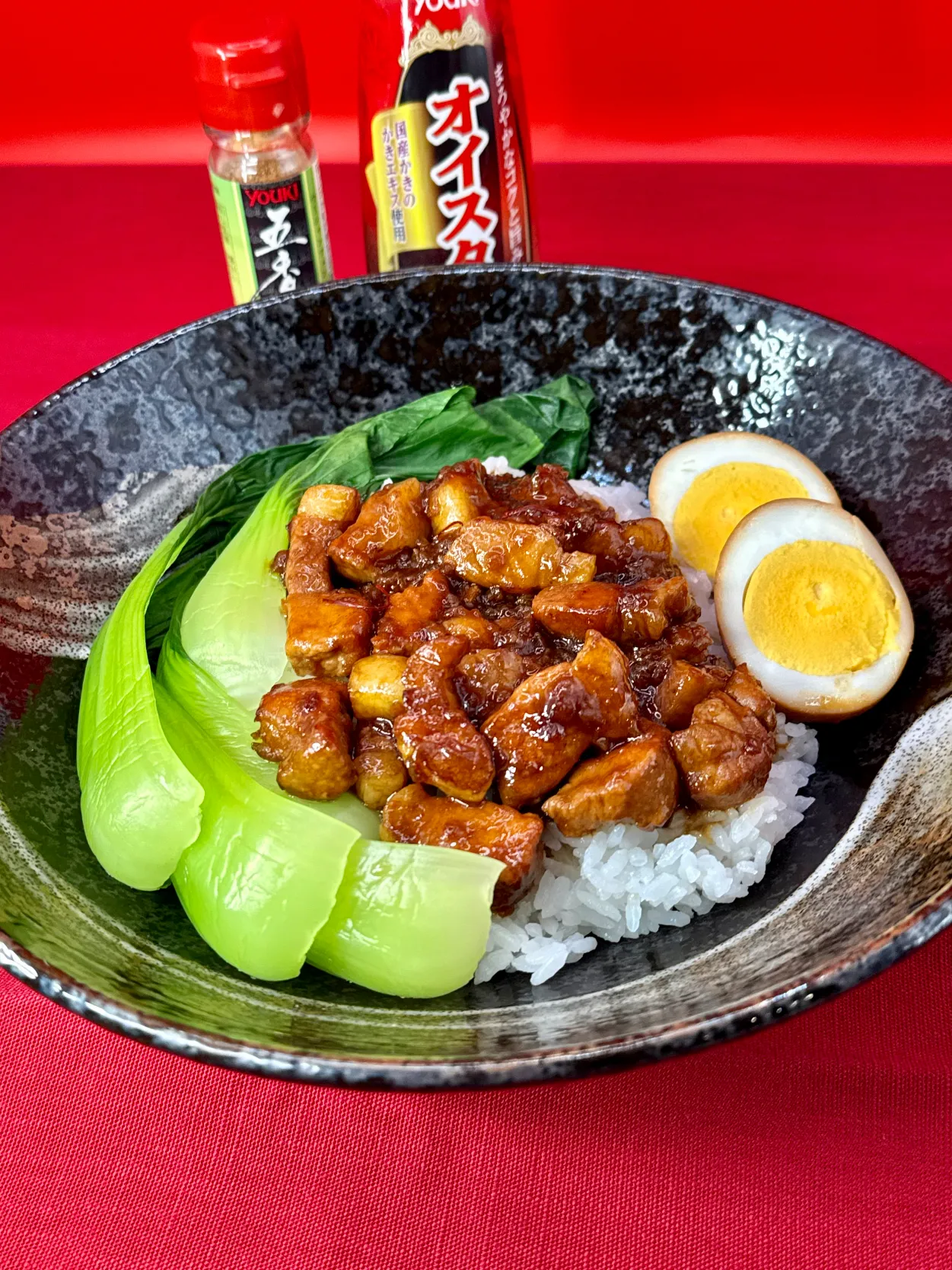 甘辛い醤油ベースの煮込み豚肉を、ホカホカご飯にかける家庭的な料理です!