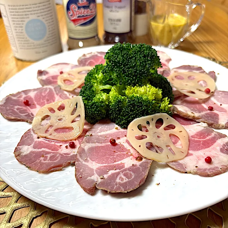 お正月に薄くスライスし、酢蓮根とブロッコリーとお皿に盛り付け、手作りの人参ドレッシングを掛けていただきました。