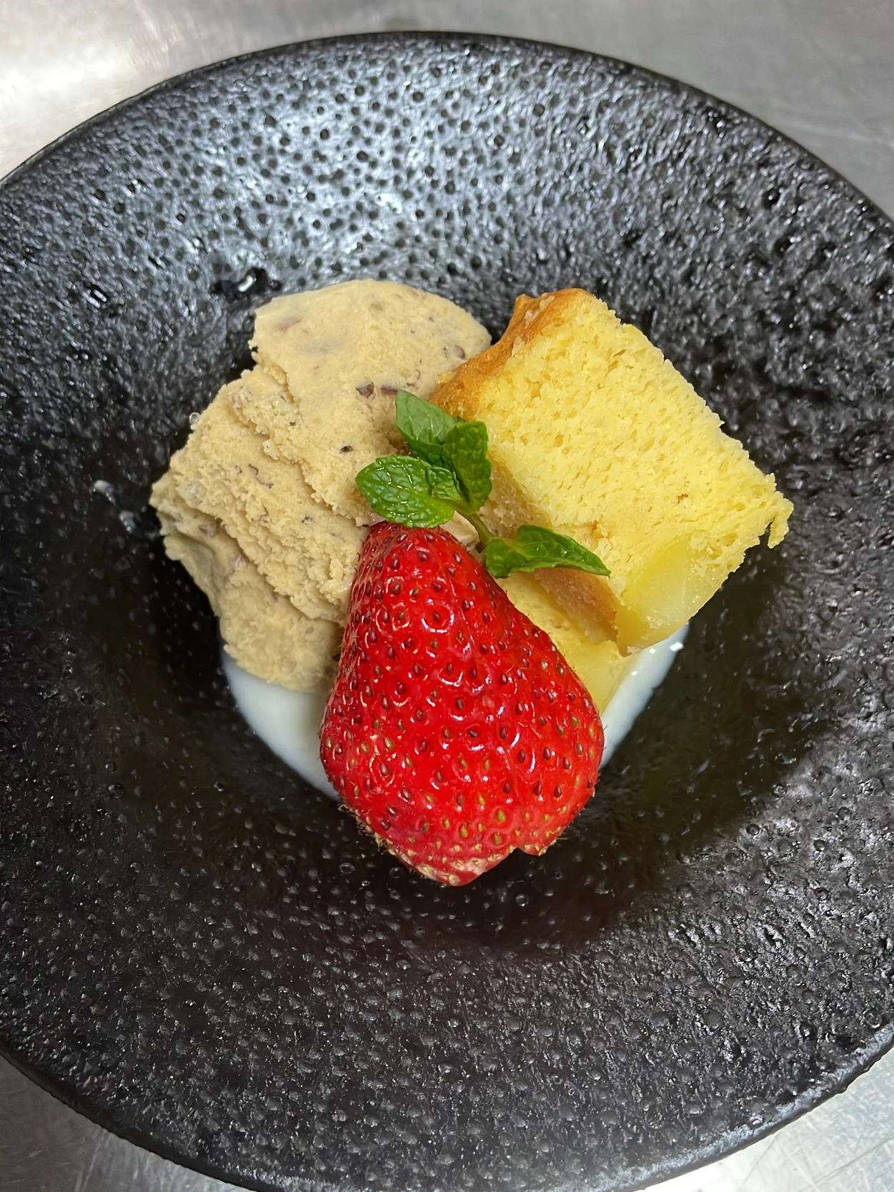 黒豆アイスと栗きんとんケーキ 甘酒ソースと一緒に。