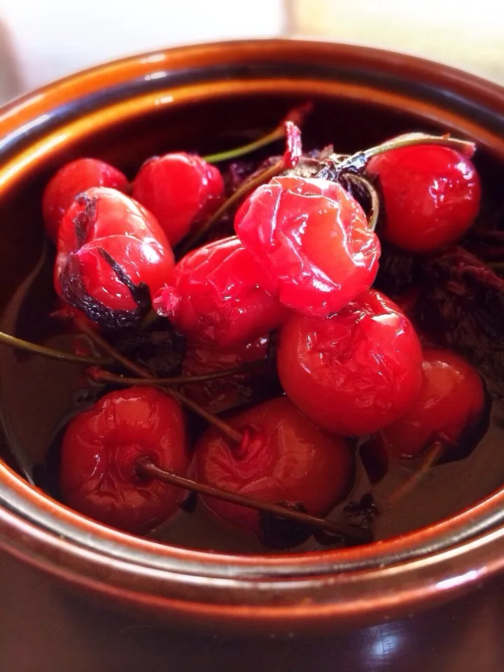 近所のおばあちゃんの話によると、梅干しのような要領で、赤じそとしそ漬けの素に生のままのサクランボを漬け込み、冷凍庫に入れておくだけーって。天日干しも無しだそうです。