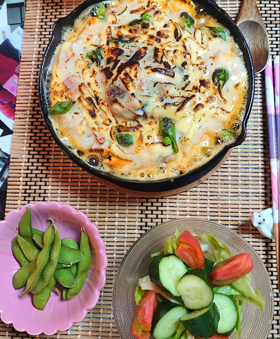 ハンバーグにミートソースとホワイトソースのせてチーズ掛けて……ドリア🍴