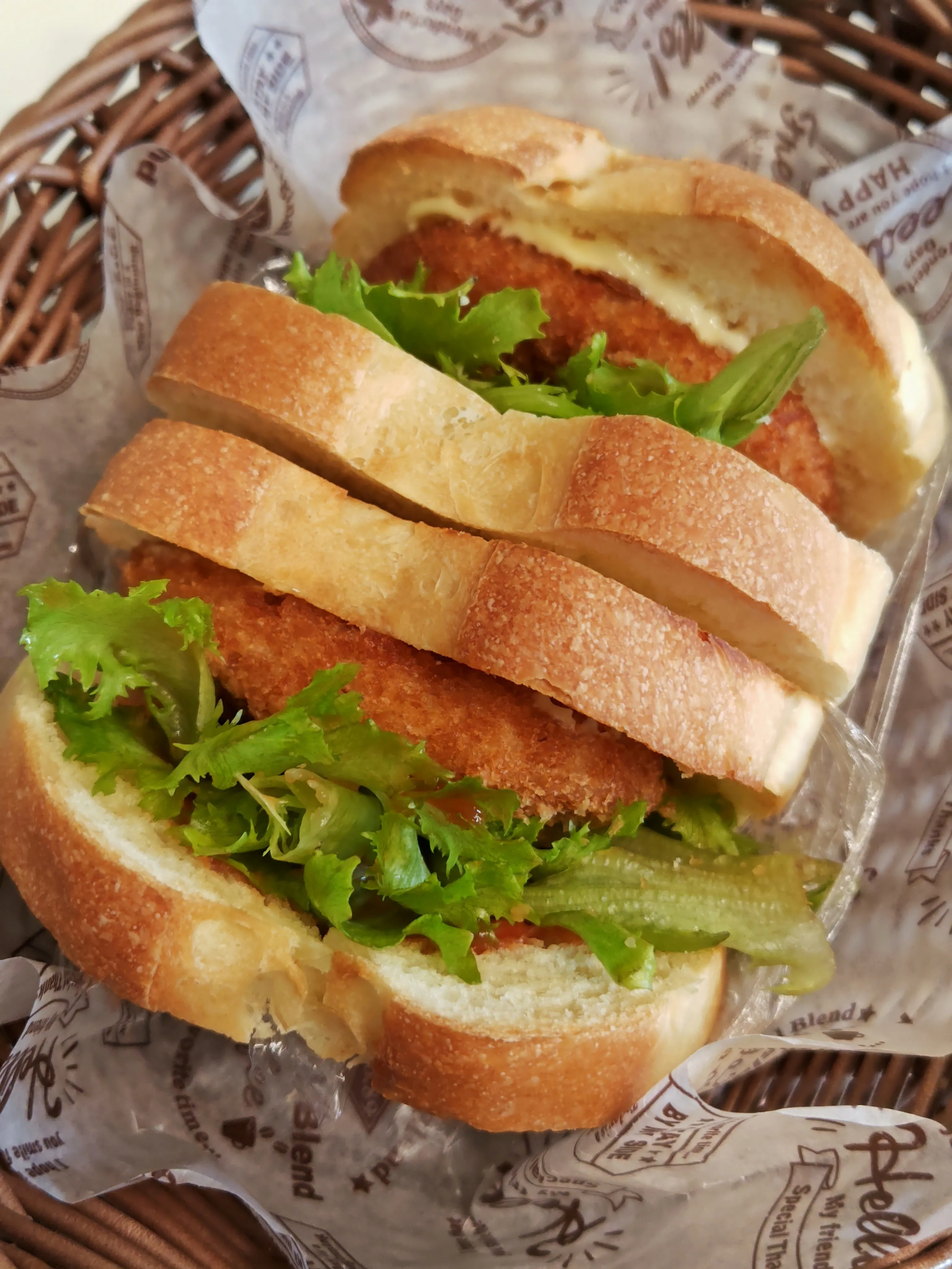 トーストした1枚はマヨネーズもう1枚はケチャップを塗りコロッケとレタスを挟んだサンドイッチです🥪
