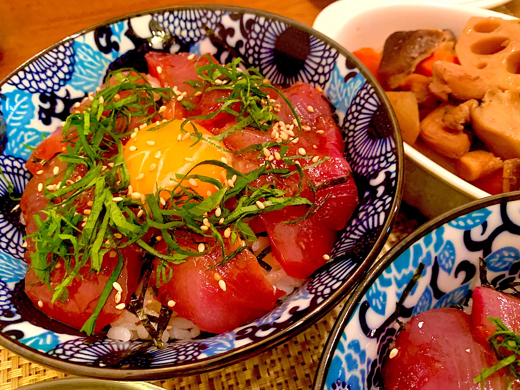 #和食 #キハダマグロ #酢飯 #刻み海苔 #大葉 #卵黄 #ガメ煮 #筑前煮 #にんじん #牛蒡 #蓮根 #椎茸 #鶏もも #記録用
