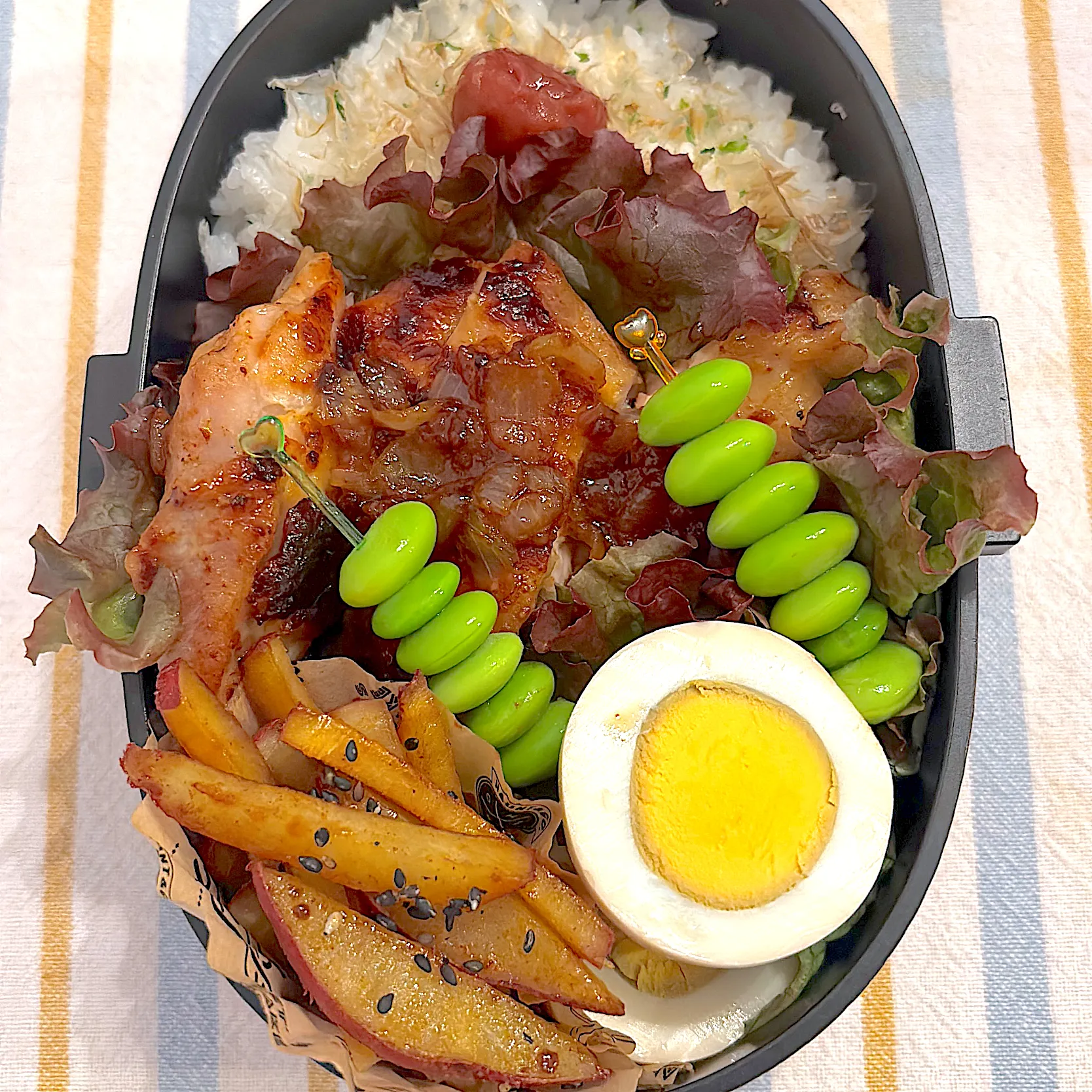 #塩麹チキンソテー #ゆで卵 #さつまいもきんぴら #枝豆 #男子高校生弁当
