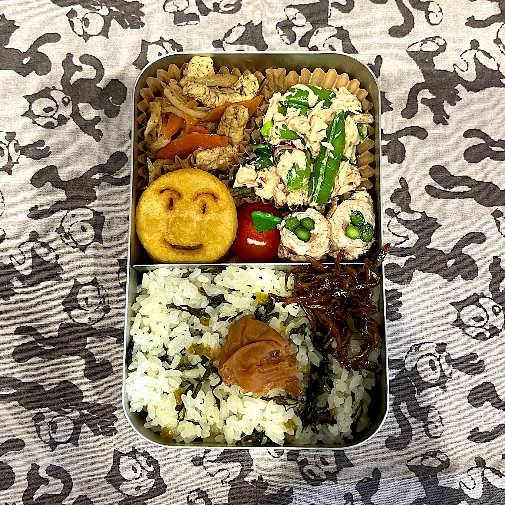 2025/05/19 アスパラガスの肉巻き スナップエンドウ🫛とツナのからしマヨ和え 切り干し大根 アンパンマンスイートポテト ミニトマト🍅