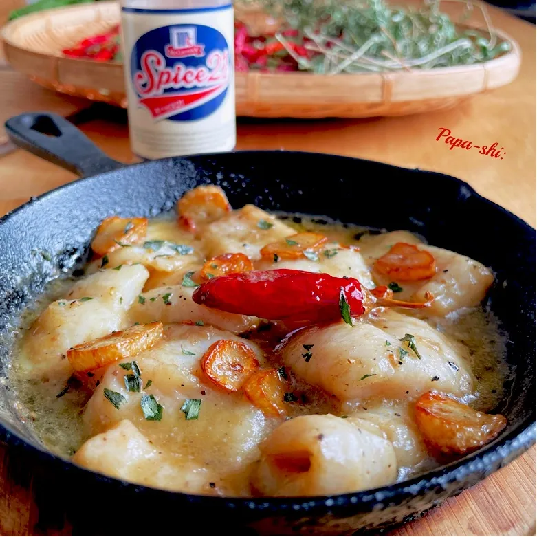 乳化したオリーブオイルに魚の旨みと唐辛子の辛味、ニンニクの香りと香ばしさ、スパイス21の安定の旨みが混じってとてもいい美味しいのが出来ました。