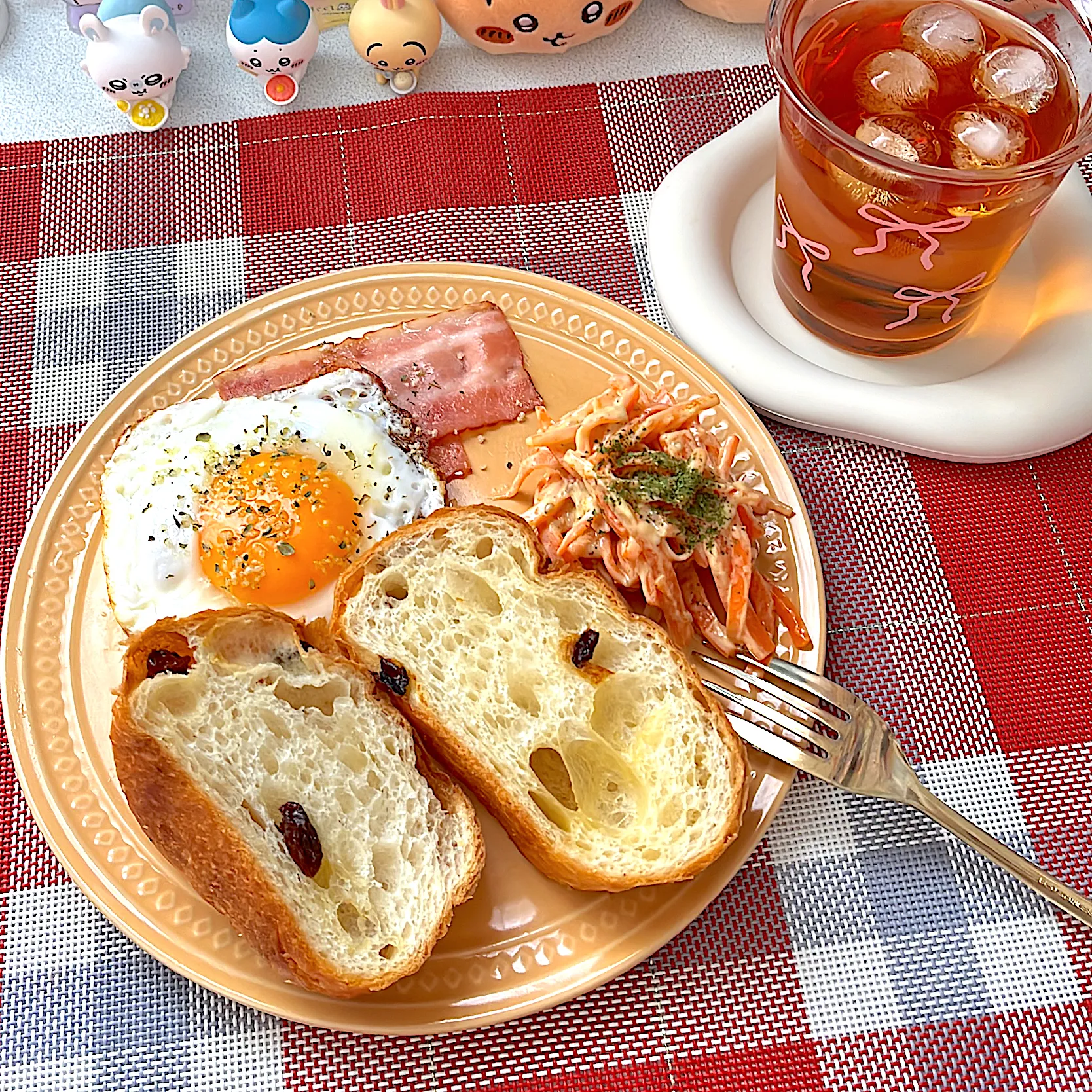 #ベーコンエッグ #目玉焼き #にんじんサラダ #パン #ランチ #自炊 #記録