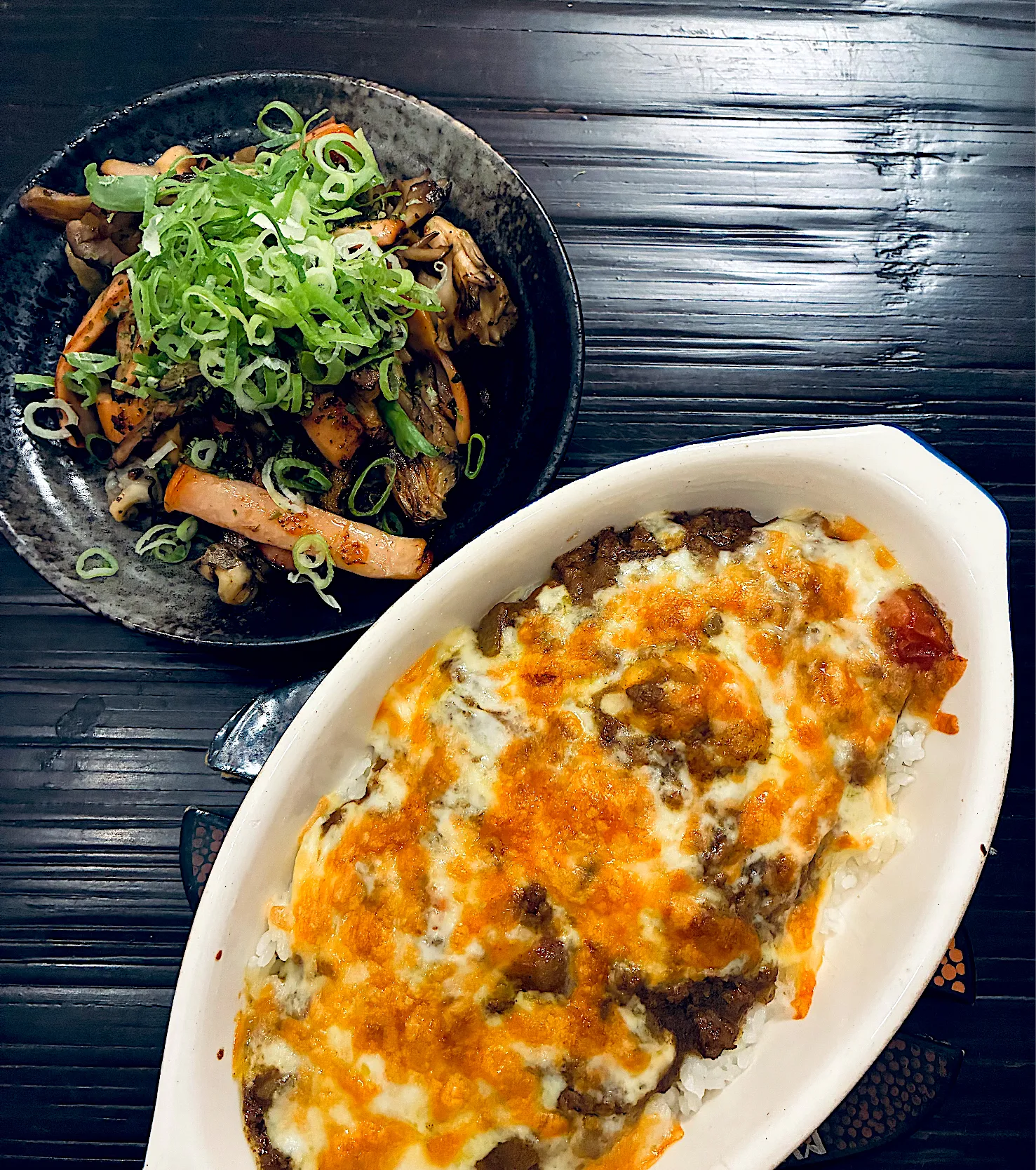 余ってたカレーはチーズドリアに。付け合わせはイカ肝バターってどんな組み合わせだよ笑