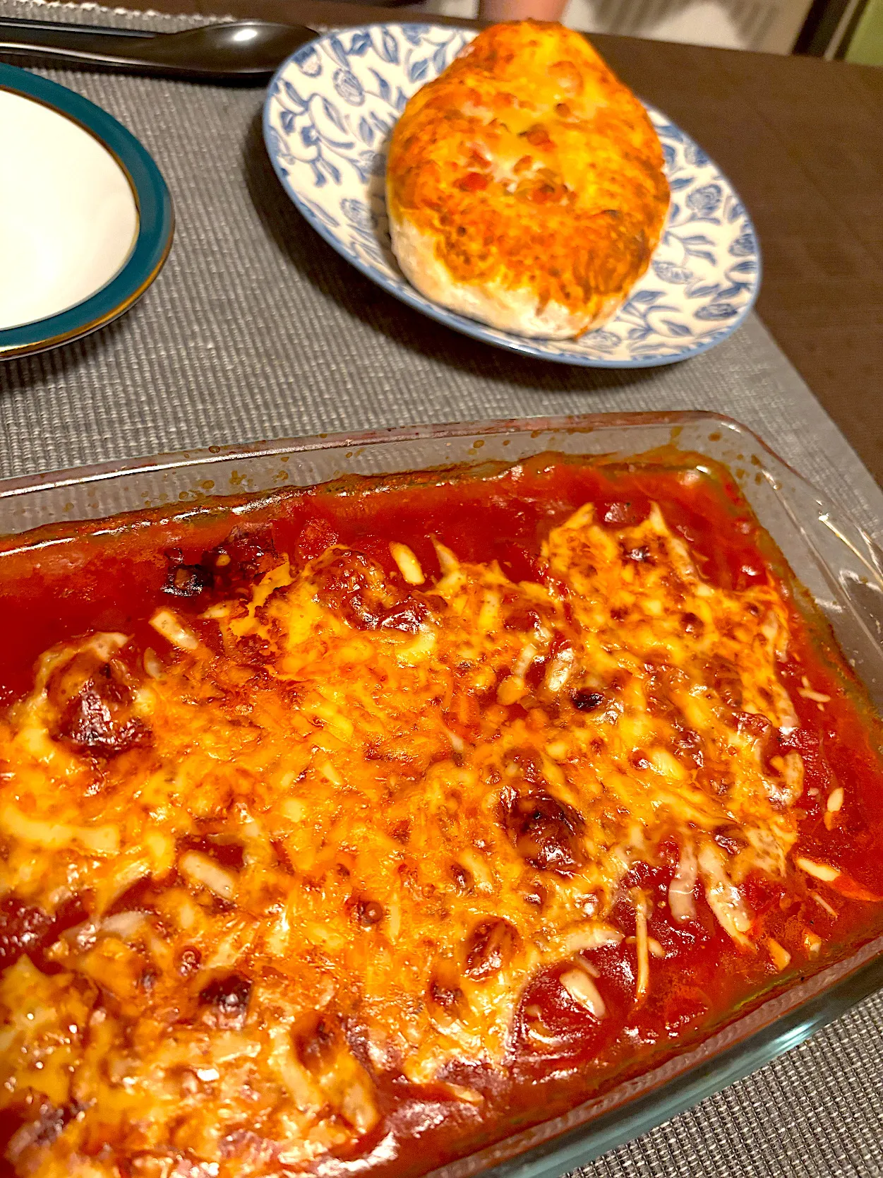 #労力節約ご飯 #ソースはトマト缶を使用 #レンチンハンバーグ #パンは外出先で買ってきた