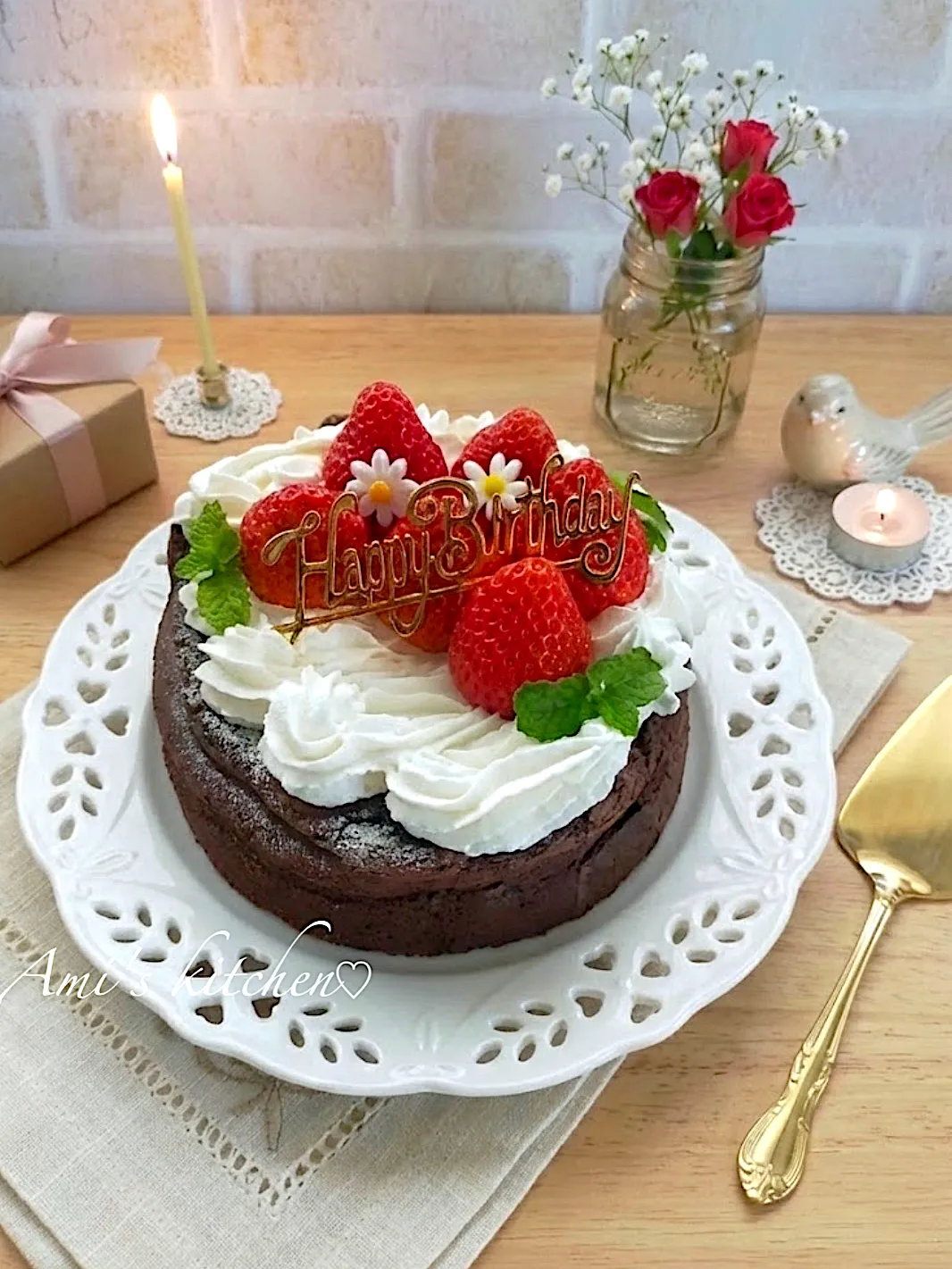 ガトーショコラに生クリームとイチゴをトッピング😍