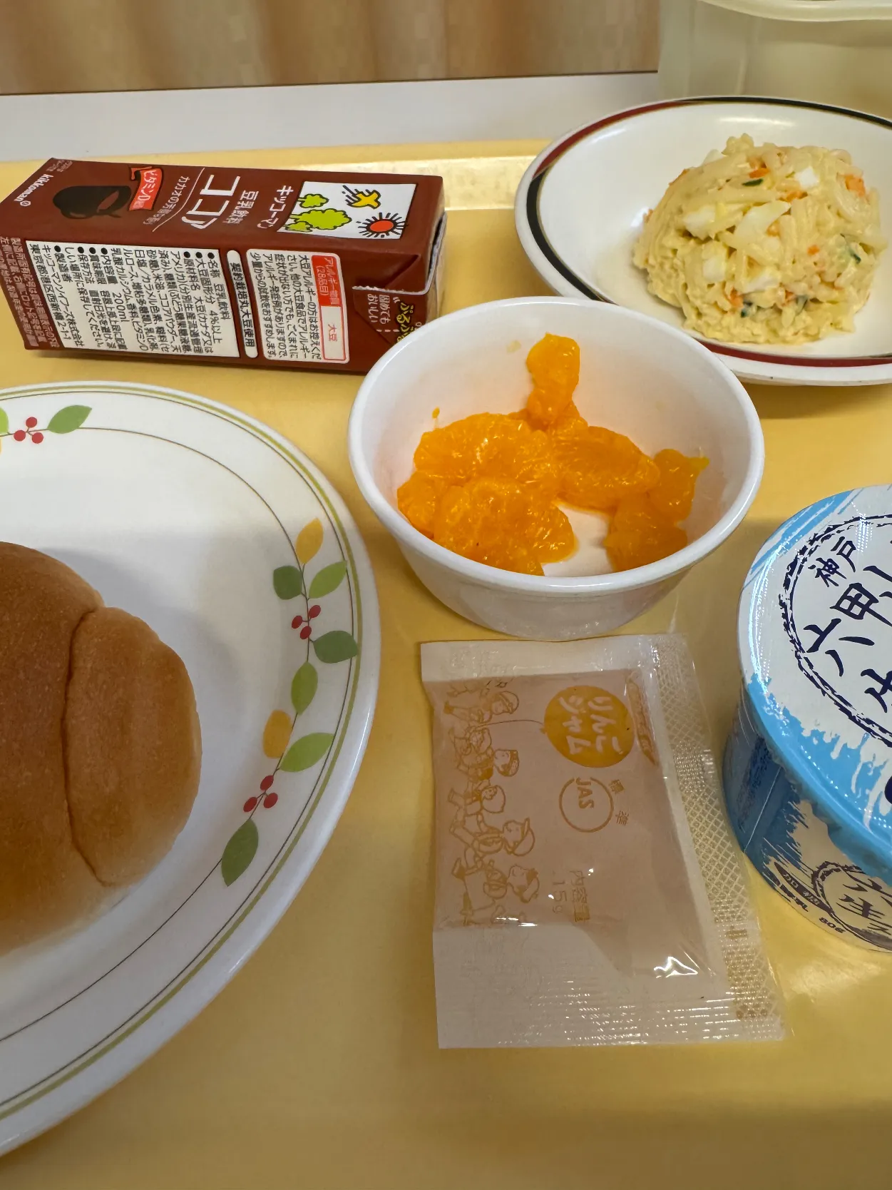 病院食 バターロール、豆乳ココア、スパゲッティサラダ🥗、みかん缶、ヨーグルト加糖