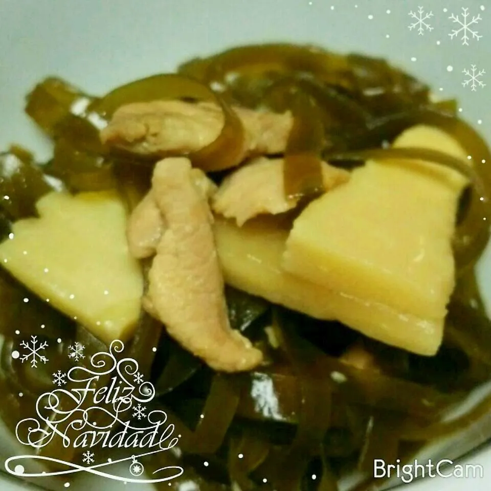 ごま油で鶏肉炒め色が変わったら、筍炒め、昆布を水気飛ばす感じで炒めたら、酒、みりん、砂糖を入れてちょっと照りが出た感じになったら、醤油と1cupの水を入れて少し煮て出来上がり♪