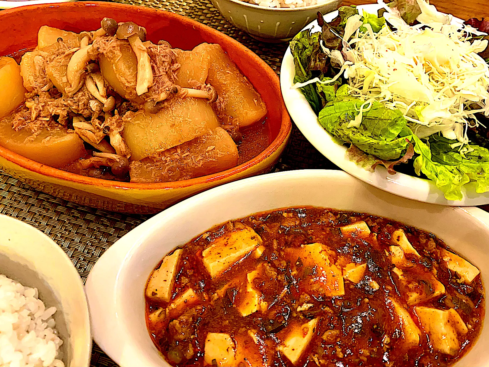 特売の大根としめじ、木綿豆腐に長ネギの青い部分を大量に刻んでお財布に優しい夕飯を。。。 麻婆豆腐のパンチには煮物のあまるい甘みで食欲増進出来ました😋
