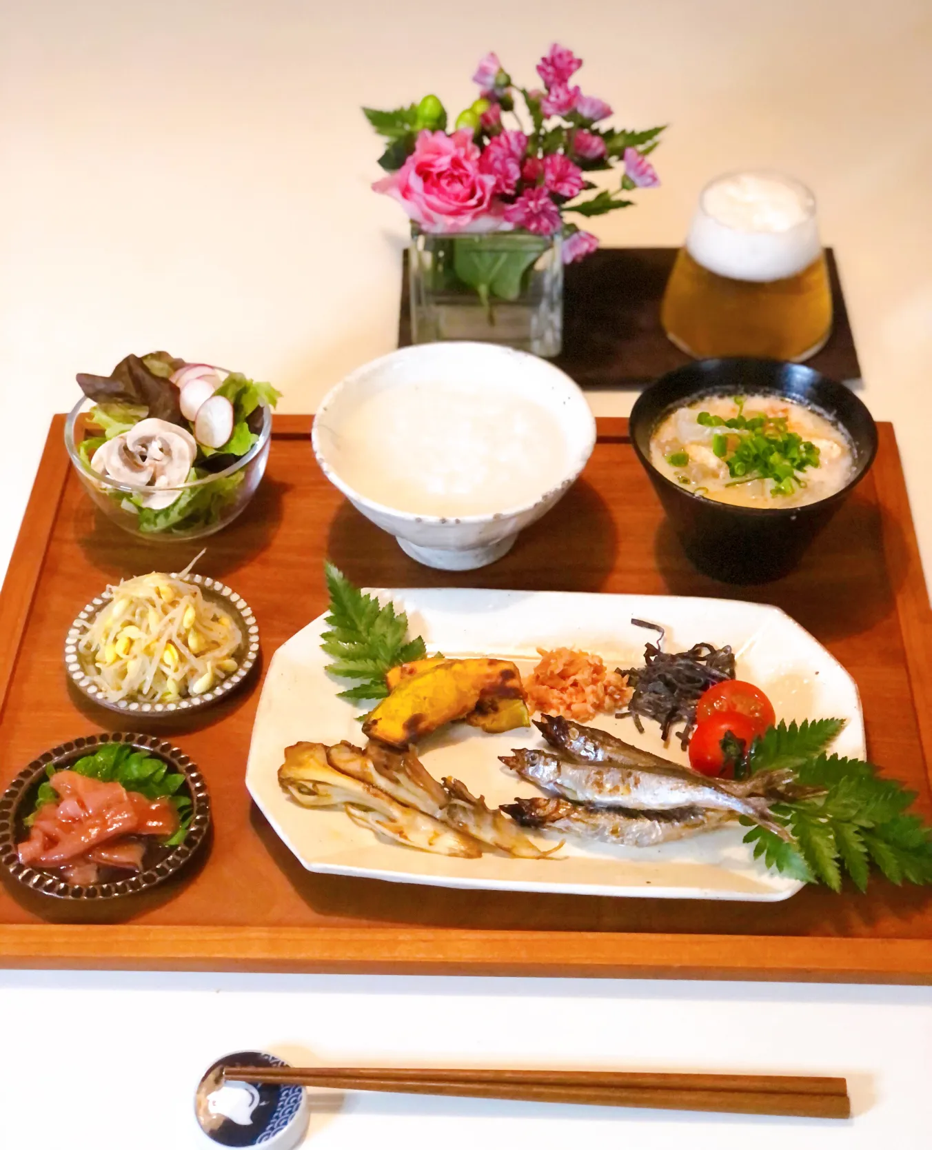 お粥 粕汁 ししゃも かぼちゃ と舞茸のバター焼き🍺😊