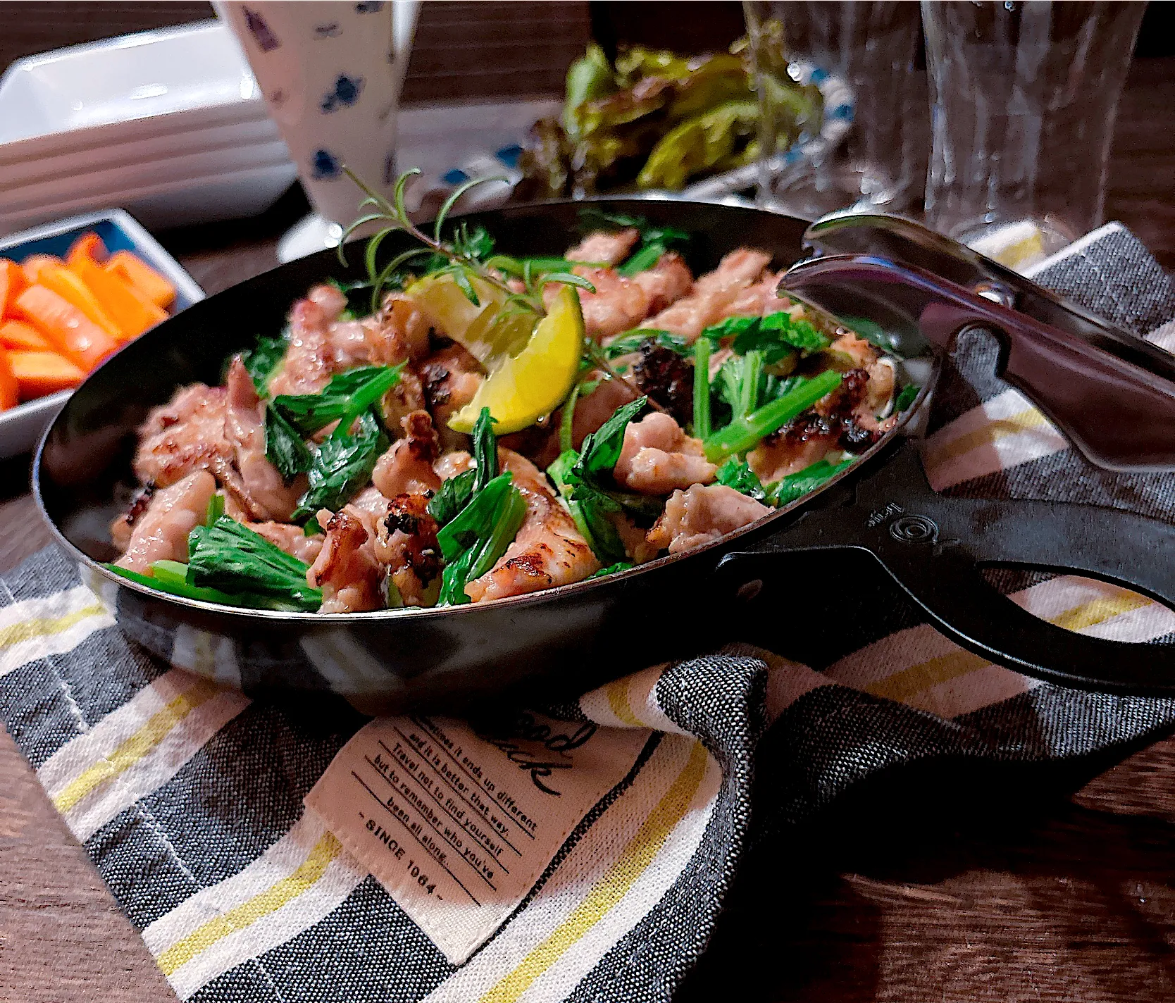 せせりを塩麹で揉み込み セロリの葉っぱと共に炒め