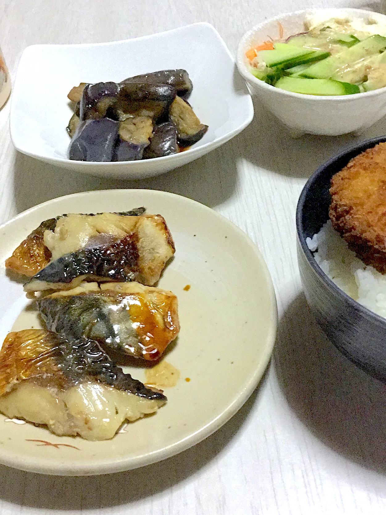 ナスの揚げ浸し、ミニサラダ、サバの塩焼き、半メンチカツ|Ayaさん