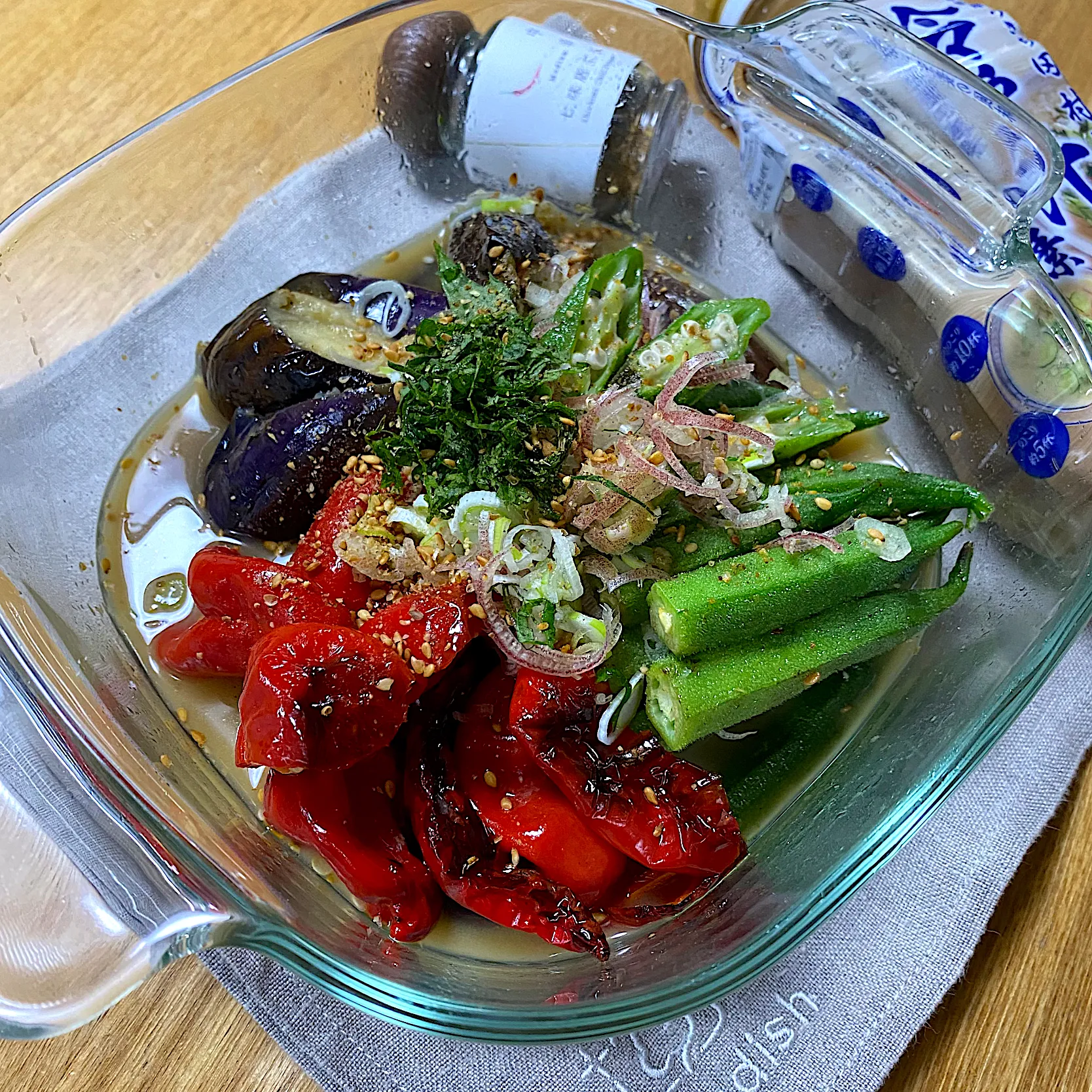 畑の茄子、オクラ、赤ピーマンと赤万願寺唐辛子(赤くなっちゃったやつ)を素揚げし、4〜5倍に薄めた冷や汁に浸けた一品。