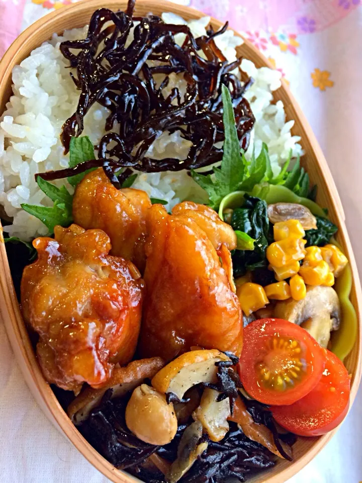 鶏の照り焼き、ほうれん草とマッシュルームソテー、ひじきの煮物