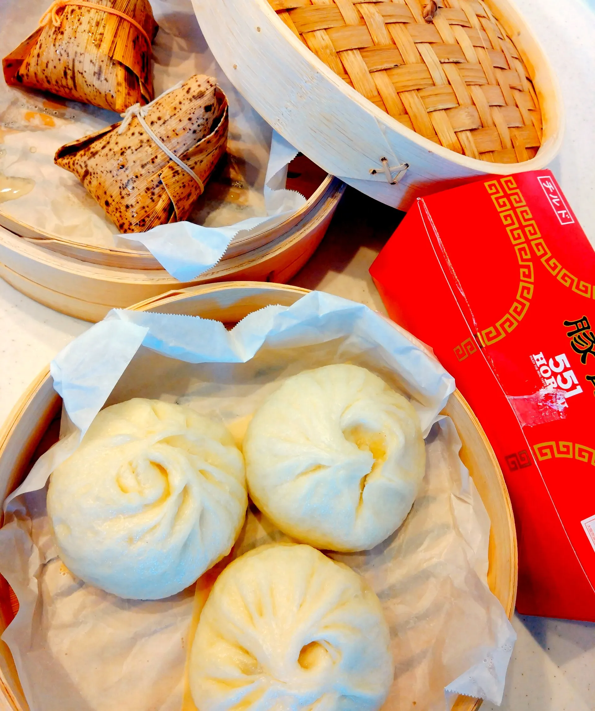 蓬莱の豚まんと中華ちまきをお土産でもらったので、蒸してお昼ごはん☺️