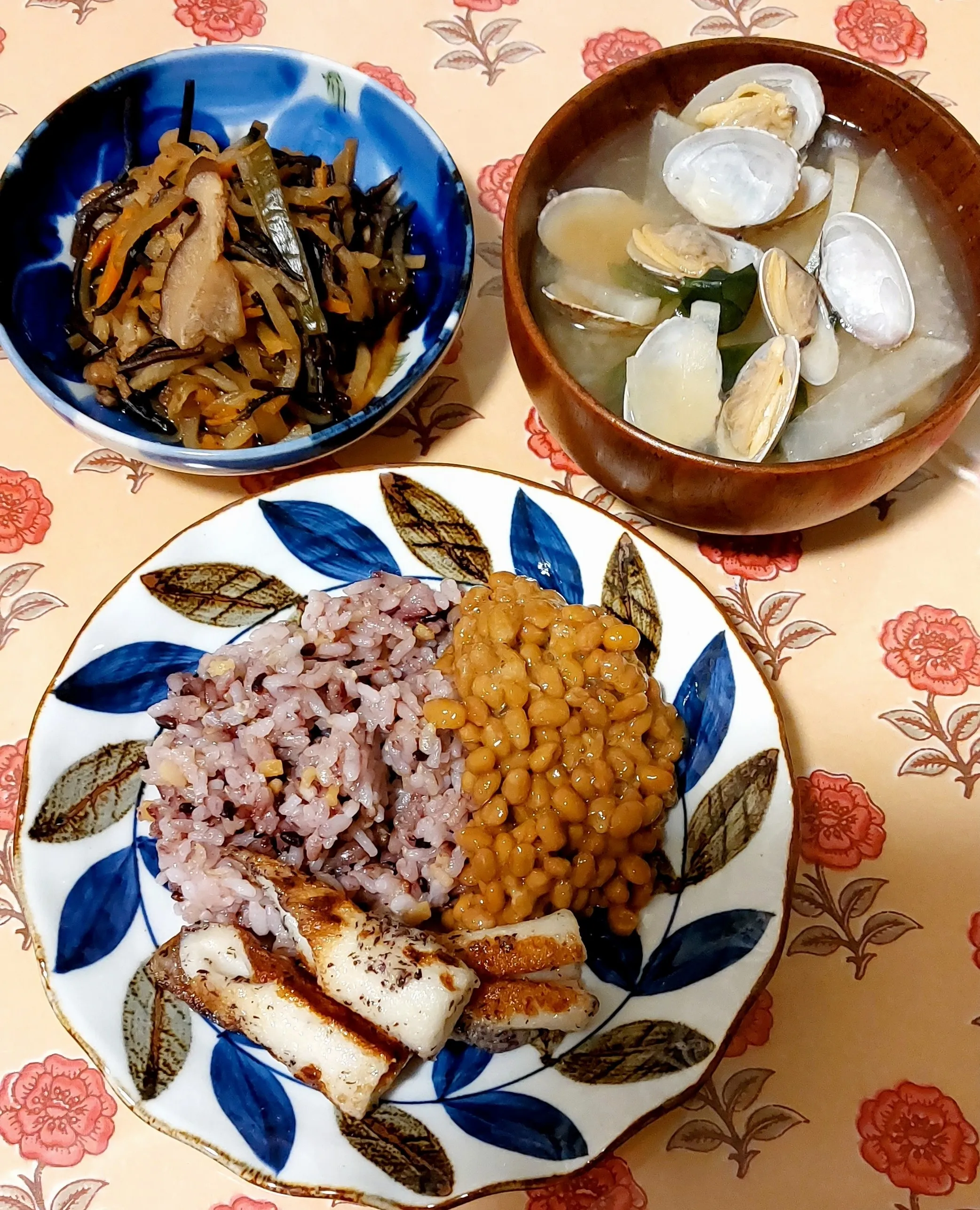 #納豆 #雑穀ごはん #ちくわ #あさりのお味噌汁 #乱れ炒め煮 #切り干し大根 #ひじき