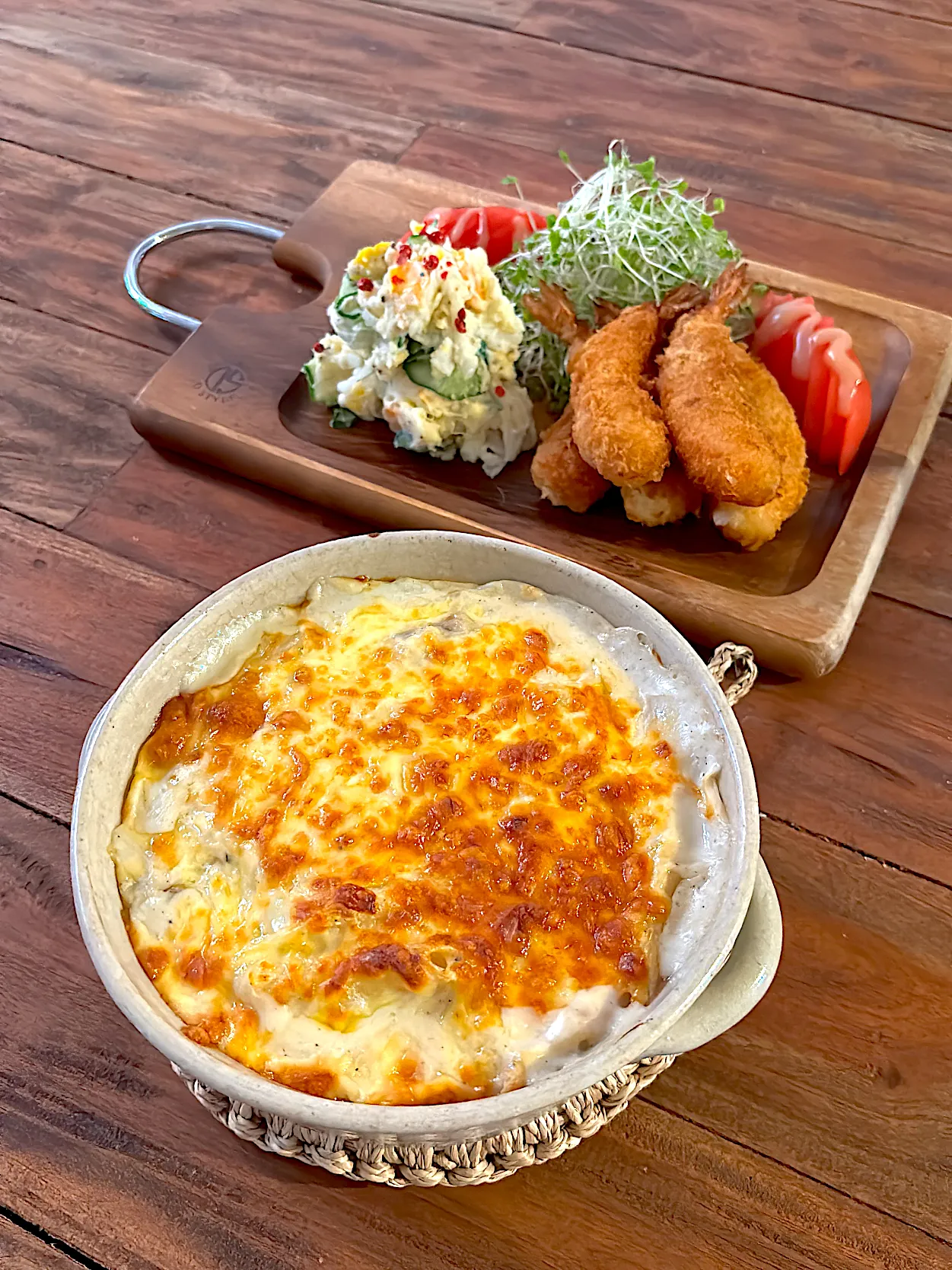 牡蠣グラタン ポテサラ エビフライ