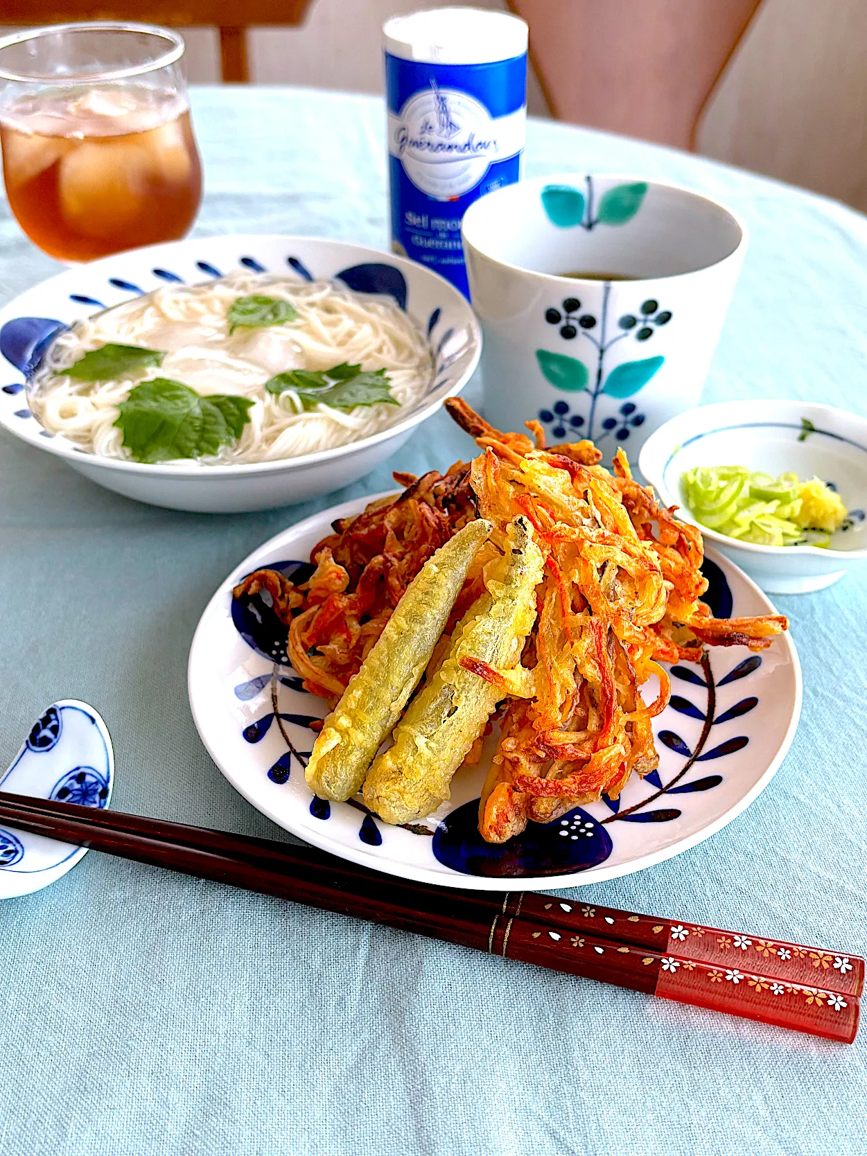 天ぷらを温め直している間にそうめんを茹でて、あっという間にお昼ごはん終了😙