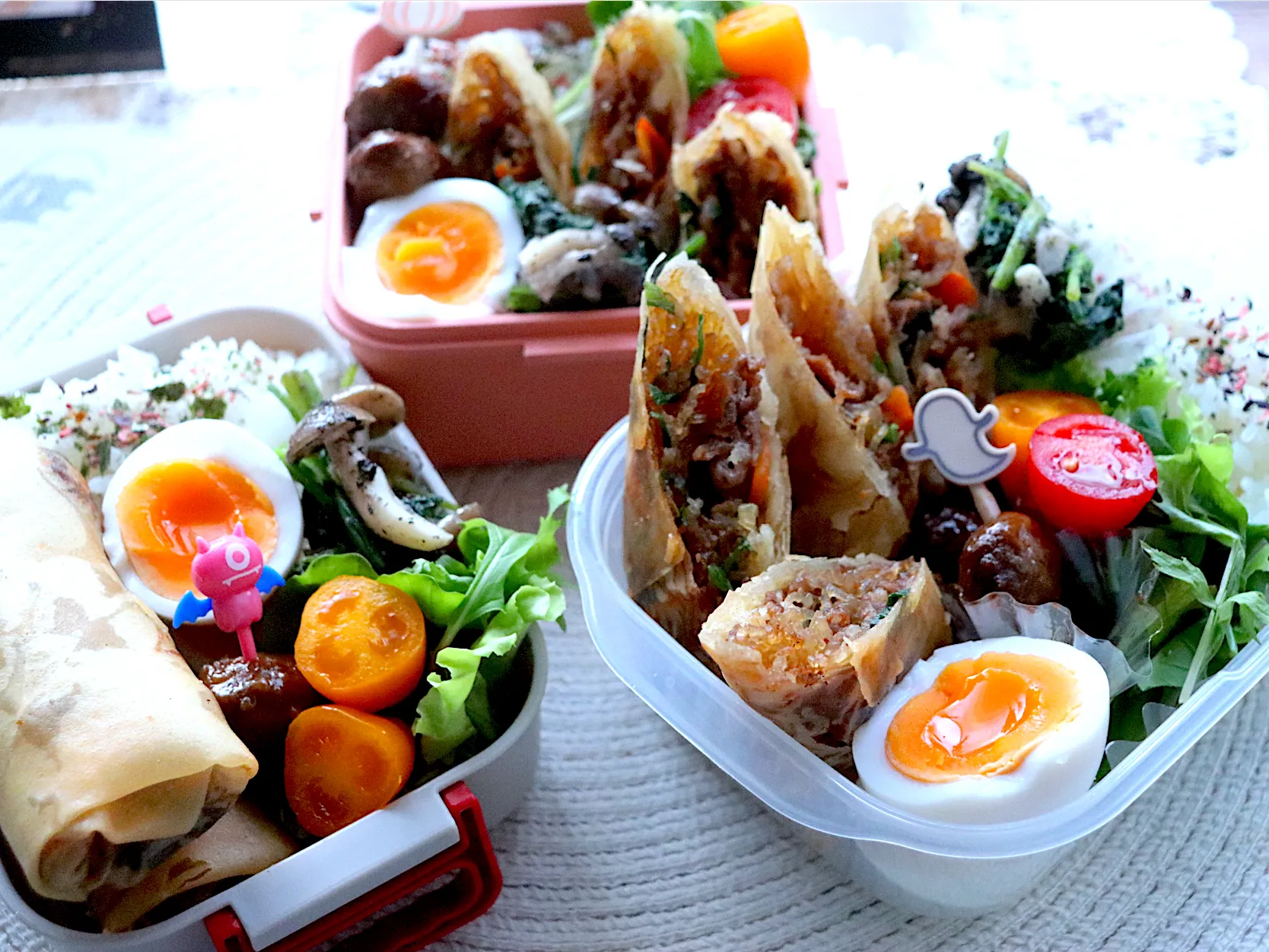 プルコギ風春巻き、ほうれん草としめじの黒胡麻和え、ゆで卵、野菜サラダ