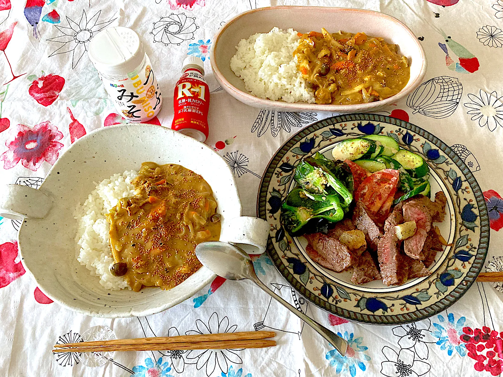 「カレーの壺」っていう便利で美味しいペーストを常備していてそれを使う事が多いです。今回、買い置きがなくて足りず…つぶみそをトッピングしましたが、正解でした◎次からカレー粉減らしてこっちが良いかも!って思いました😊